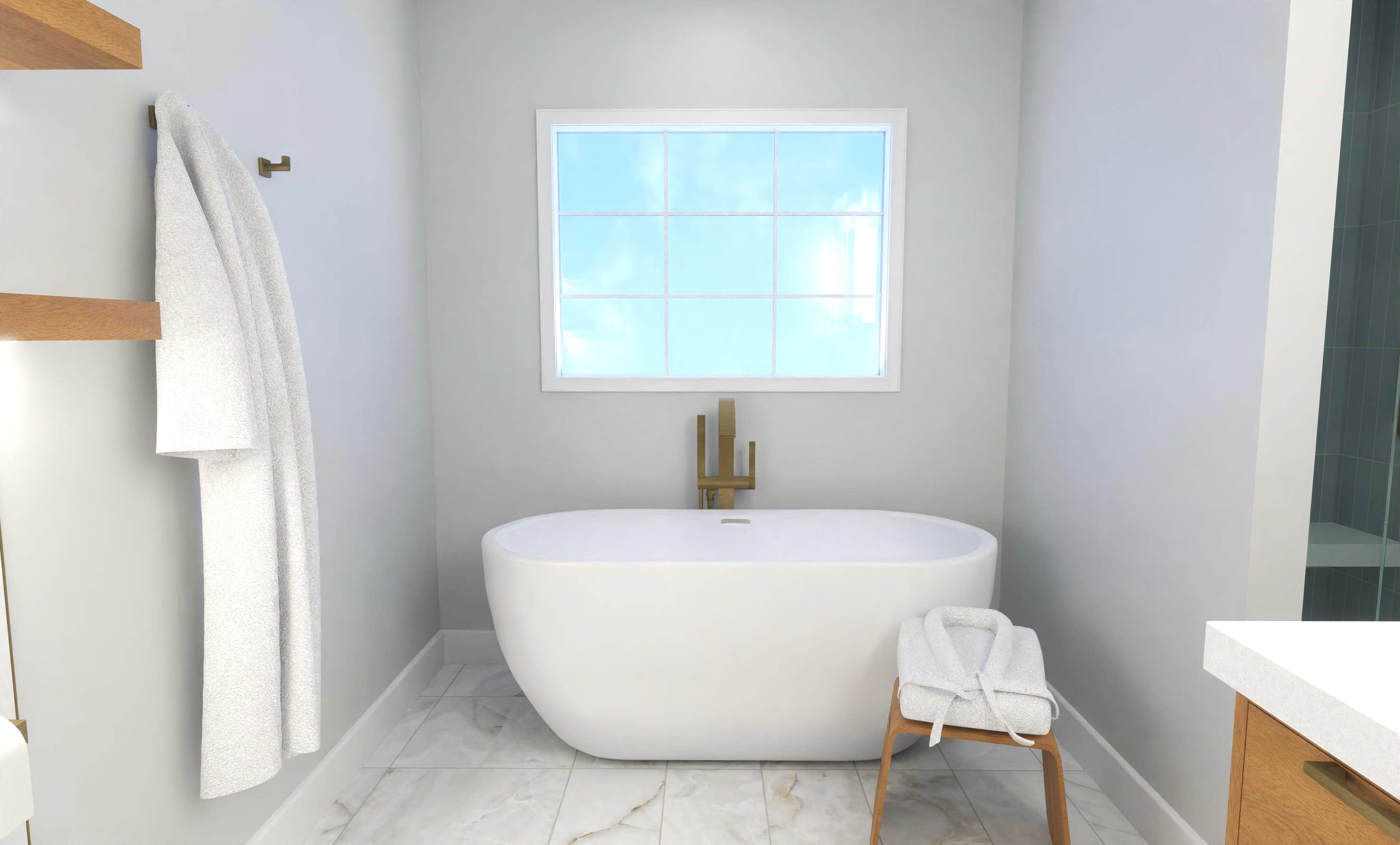 very lightly accessorize this master bathroom and maintain wall color and do not add anything behind the tub