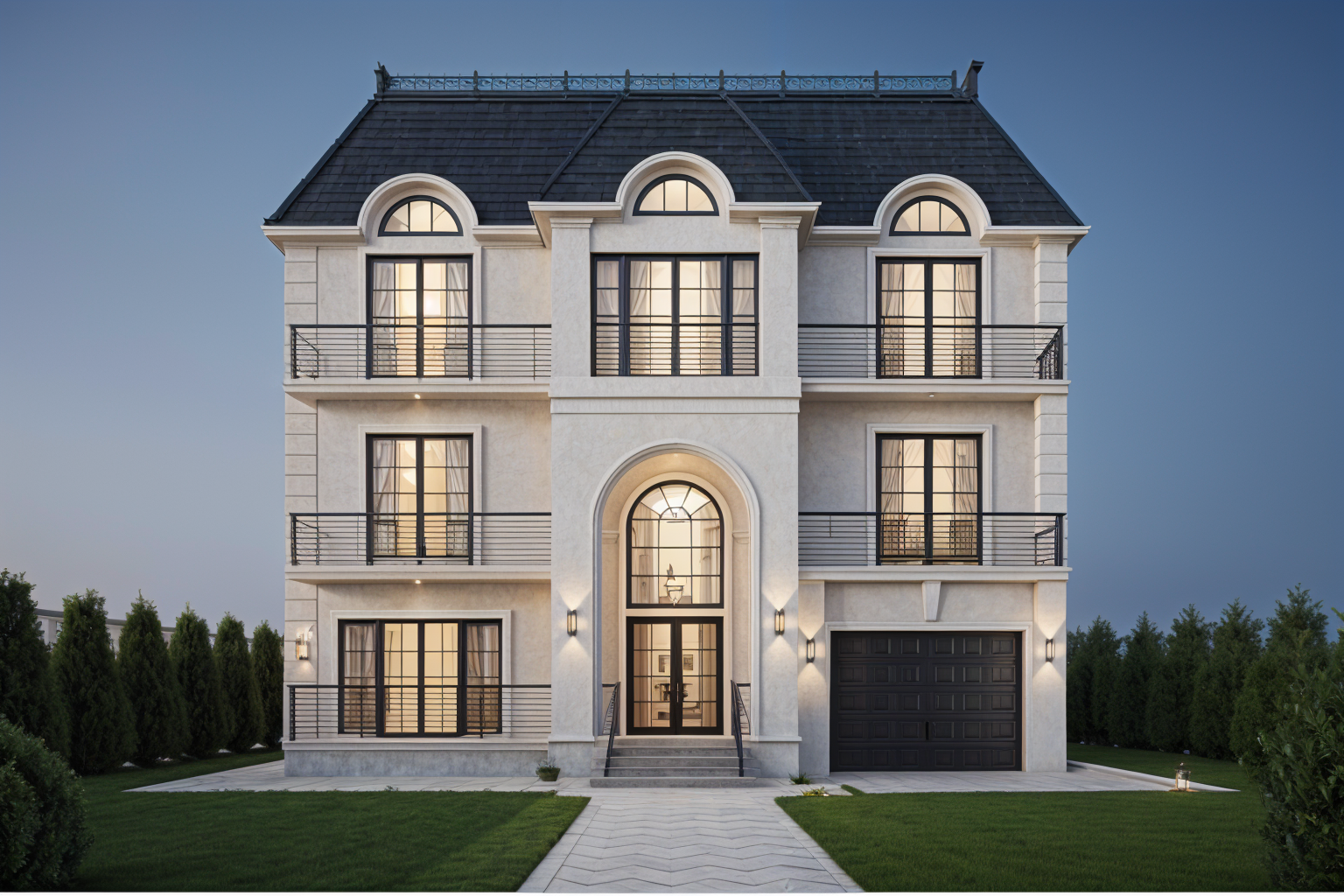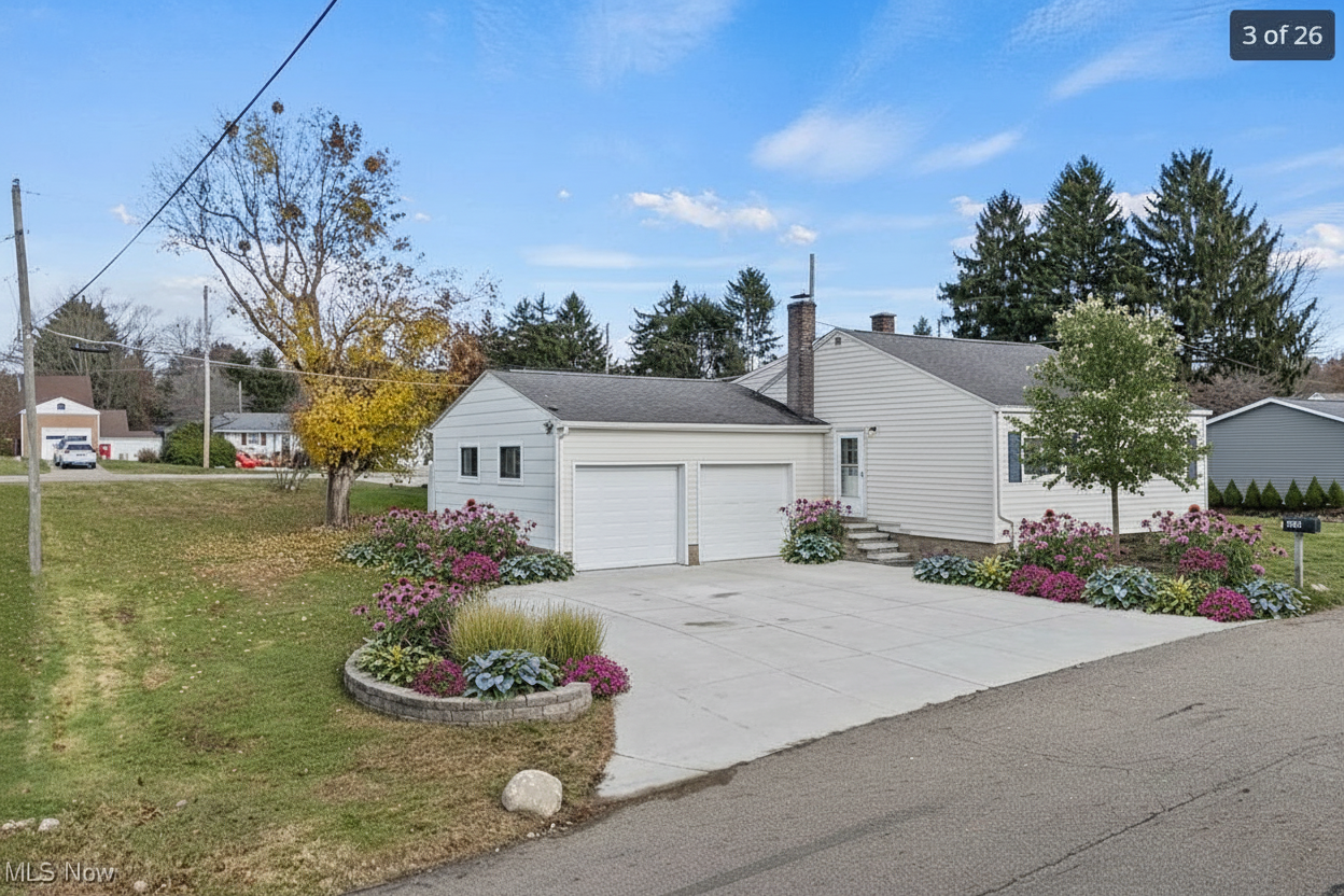 update the landscape of this home to have plant beds with modern plant selections in ohio such as white hydrangeas and boxwoods include an ornamental tree on the side of the house paint the house a modern residential house color