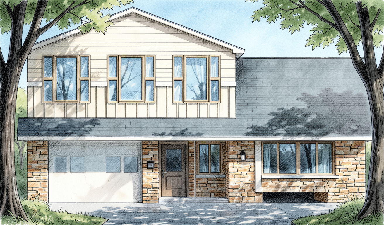one story contemporary midcentury butterfly roof light stucco beige copper marble large format tile siding and tan ledgestone dirt driveway