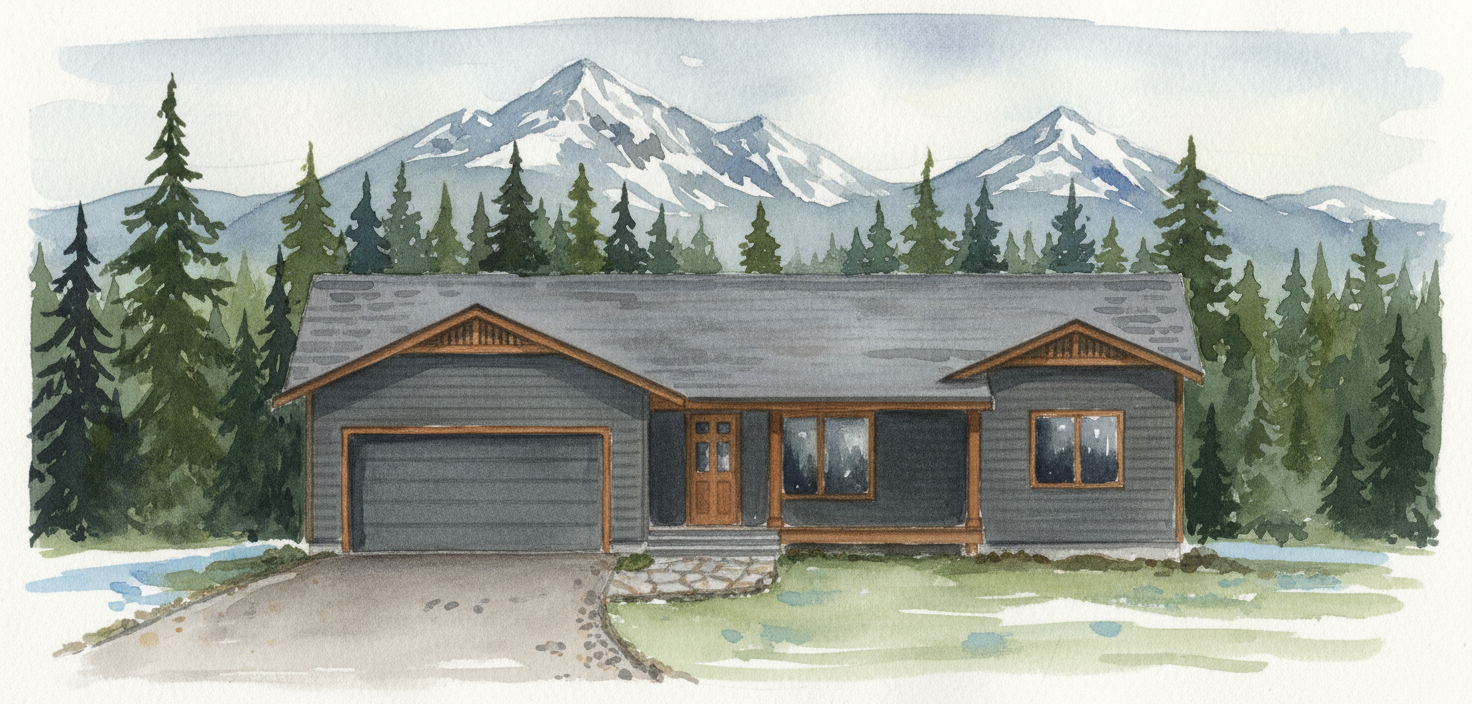 simple watercolor render of modern style home with dark green paint black trim and stone accents include trees and an alaska like environment in the background simple driveway and walkways in front of the home