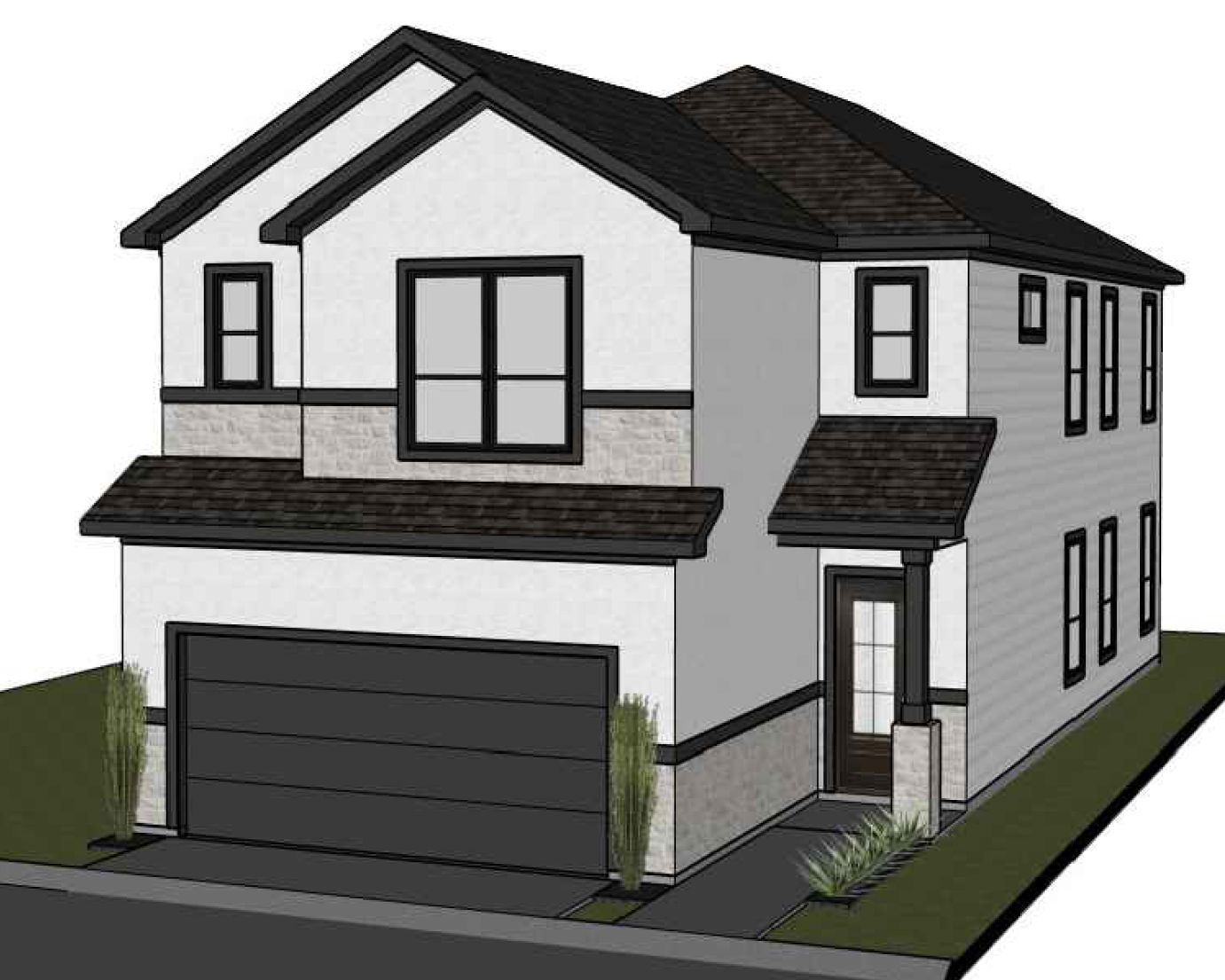 create a photorealistic render of this house design using the first image as the architectural base match the lighting color palette and realistic textures of the second image the house should have a modern urban contemporary style with white smooth stucco walls dark charcoal trim and windows and black roof shingles add natural daylight illumination around 5 30 pm houston central time with a warm tone use soft landscaping similar to the second image small green plants ornamental grasses and a few trees in the background keep a clean sky with light clouds and ensure balanced shadows and reflections for a high quality photorealistic finish the garage and front door should remain black matte with metal or wood texture detailing background environment should resemble a suburban neighborhood with similar modern houses nearby negative prompt avoid exaggerated colors night lighting heavy contrast cartoonish or unrealistic textures and overly saturated greenery