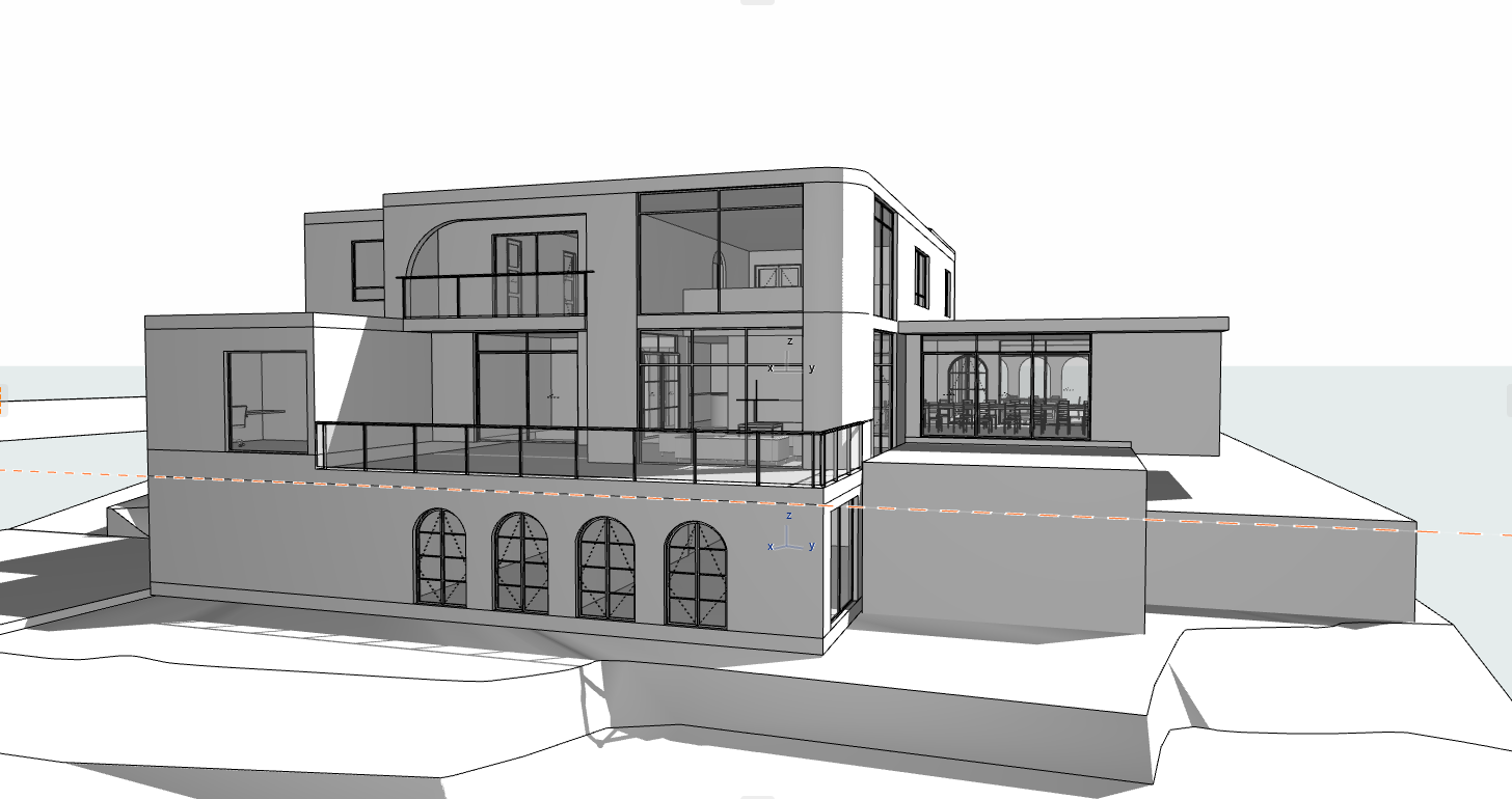 mediterranean revival exterior shot colour pencil render a modern luxurious multi story mediterranean villa with arched windows set on a coastal hill use soft cream and beige for the exterior walls with elegant black railings and window frames the glass should reflect a clear blue sky casting gentle shadows surround the building with lush greenery and vibrant flowers in various shades of green pink and purple create a serene atmosphere with a warm golden sunset enhancing the villa s modern architectural lines and adding a sense of warmth and tranquility architecture