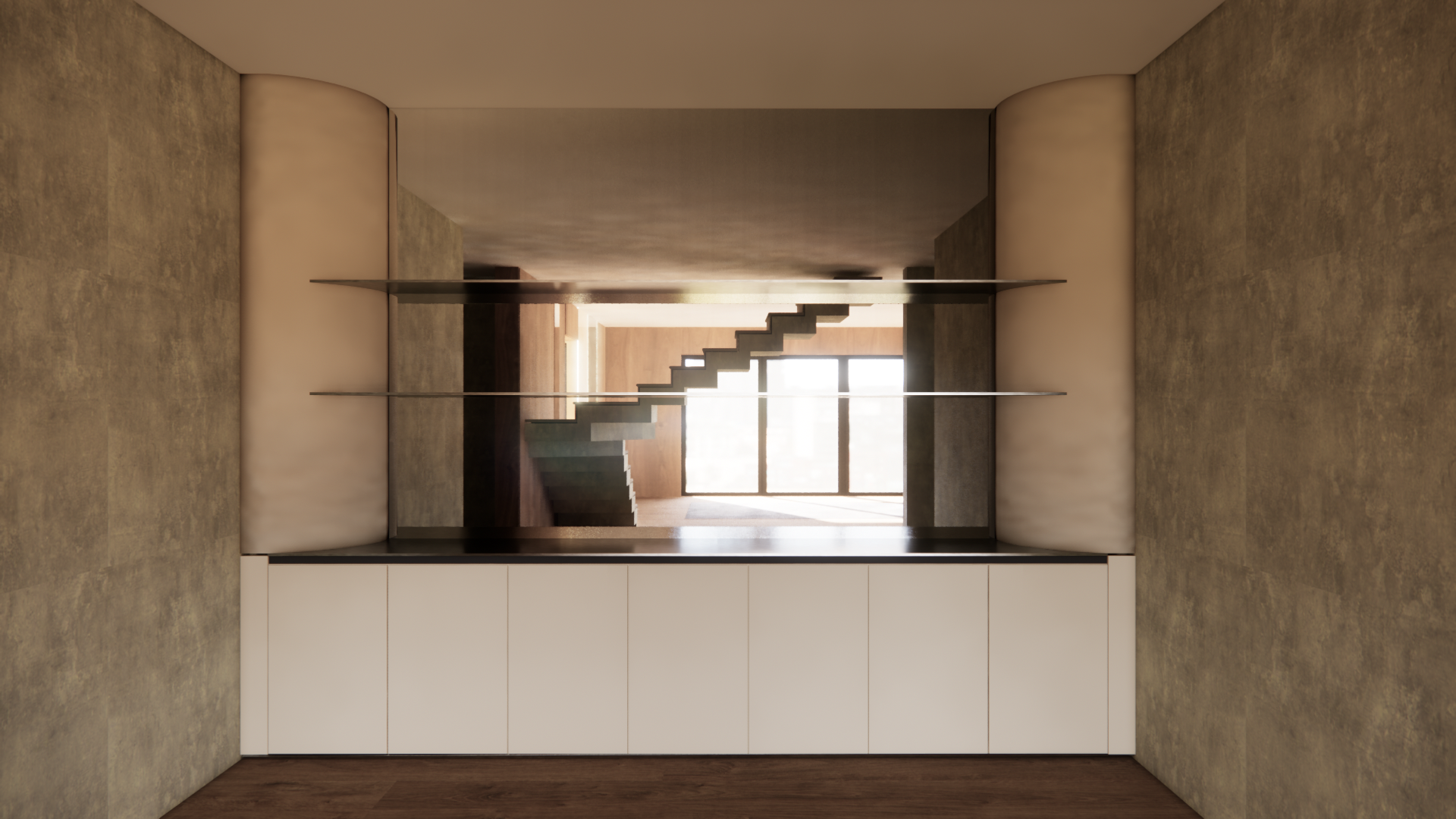 modern console brown metal shelves mirror and beige colored cabinets super modern great ambient same beige color on columns countertop is metal brown