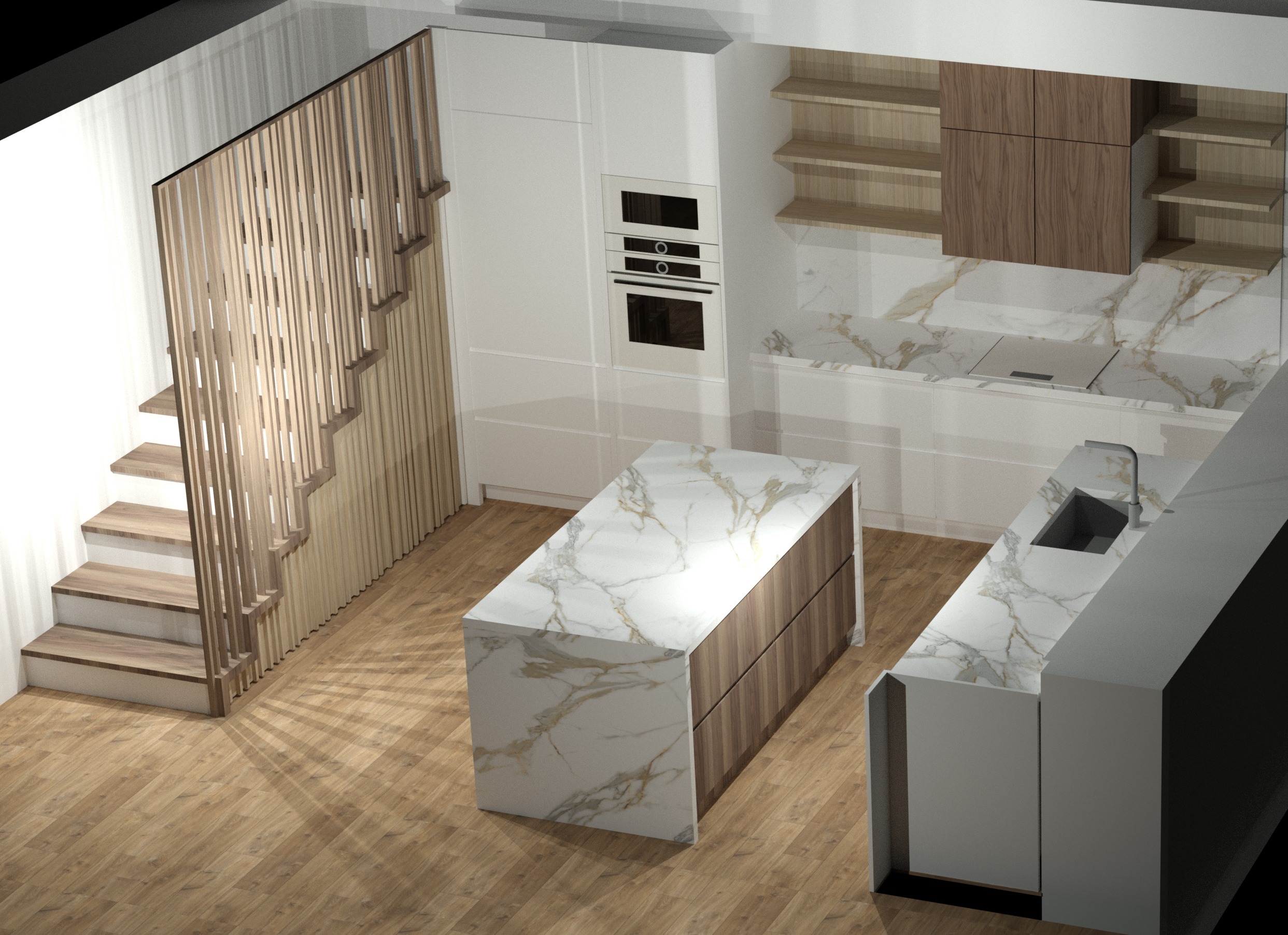a adir realismo maximo distinguir 2 tonos de madera en los muebles el mas claro es roble claro y el oscuro es roble oscuro a adir decoracion de cocina en los estantes y luz indirecta en los estantes altos