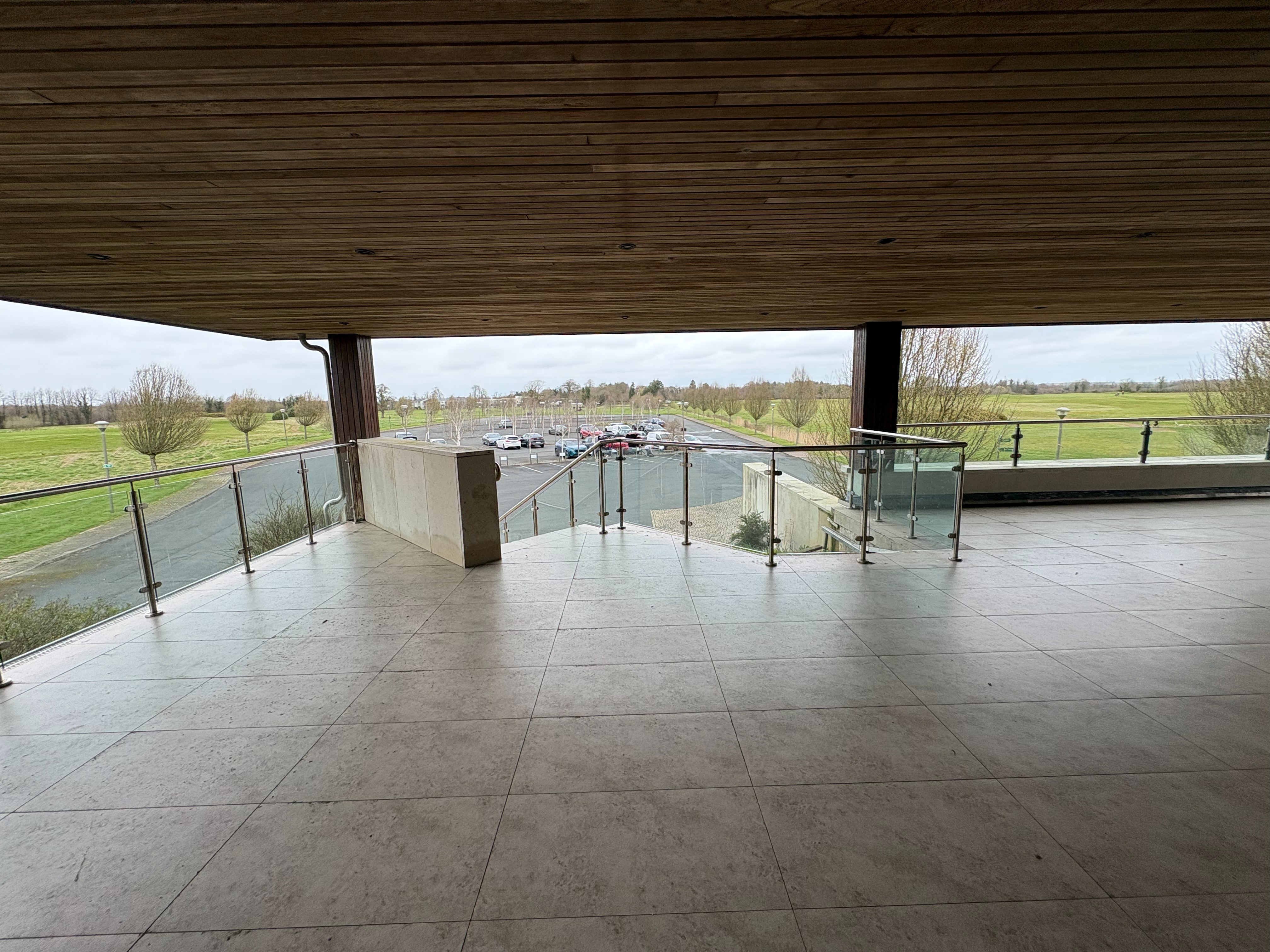 external spa terrace of with loungers and fire pit and planting boxes with timber panelled screen to external perimeter with background maintained