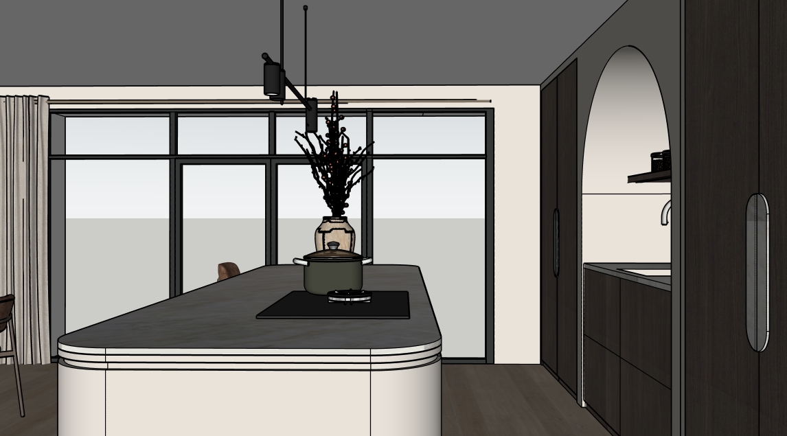 make the kitchen countertop in taj mahal stone matching the oval handles on the tall cabinets and paint the bottom part in beige miral paint install an led strip under the shelves and make the counter top less glossy make outside a garden less plants