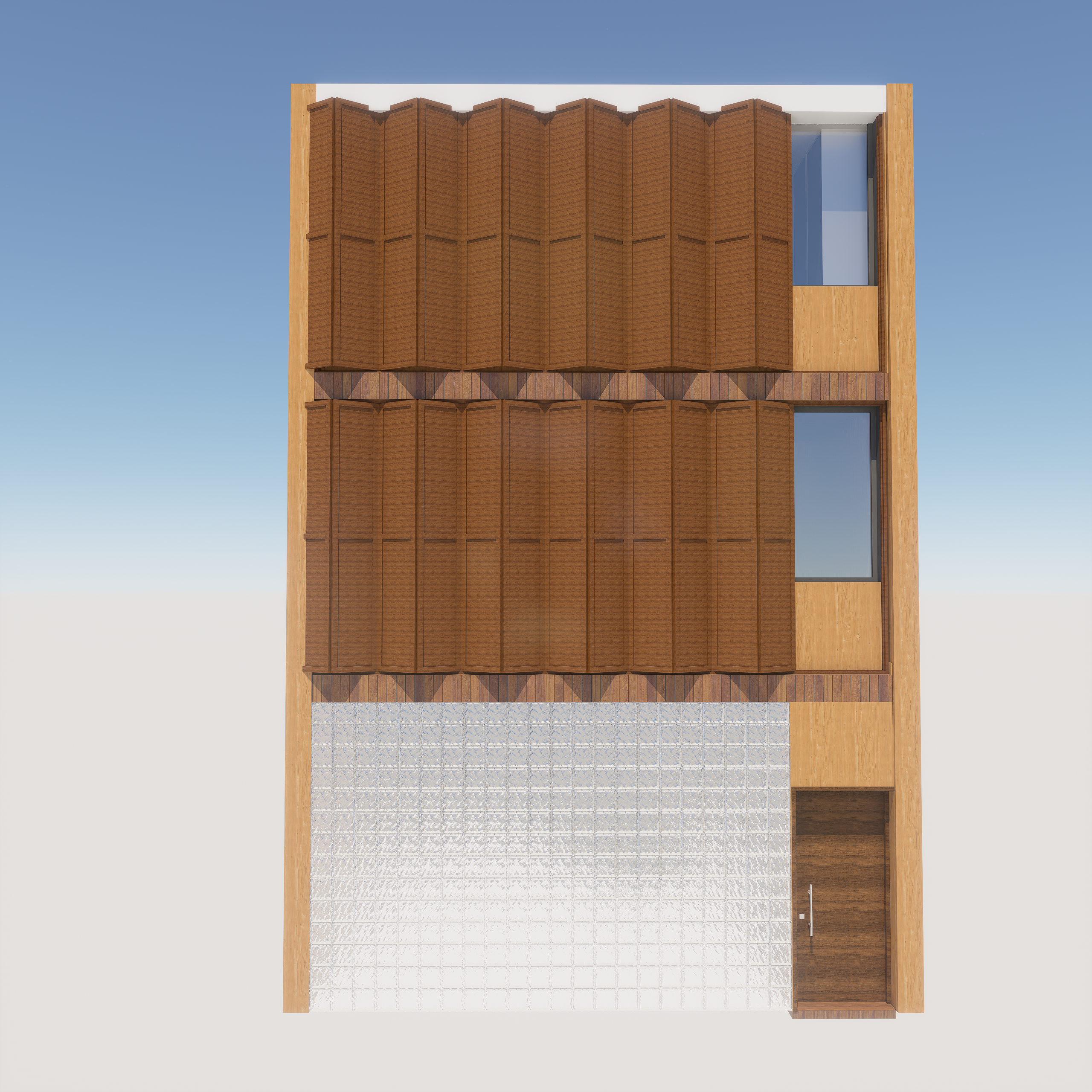 la parte de abajo blanco es un muro de vidrio de bloques de pav por donde ppasa la luz pero no se ve lo de dentro el resto de la fachada hazla del mismo material todo de madera como la imagen de referencia los paneles verticales quebrados que se ven dos piezas una en la parte superior y otra en la intermedia son paneles plegables que sean de madera mas oscura