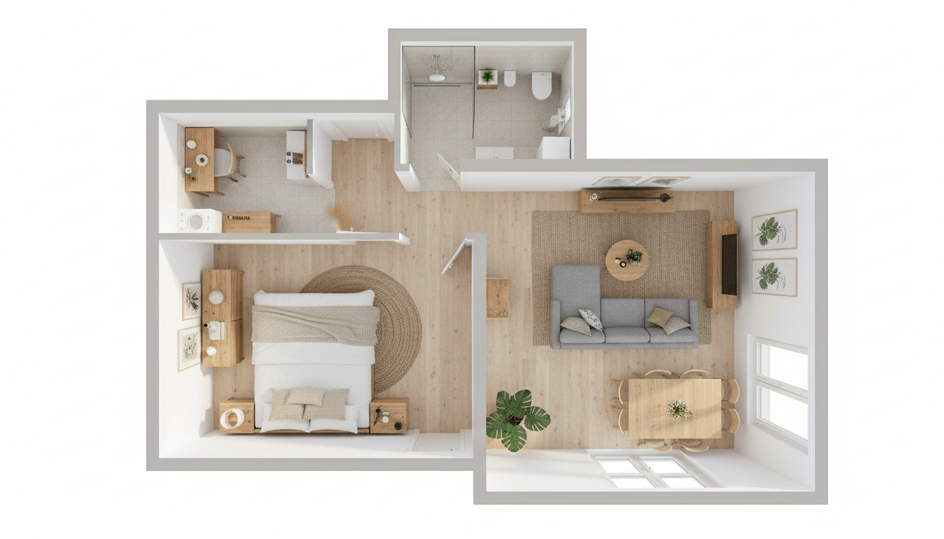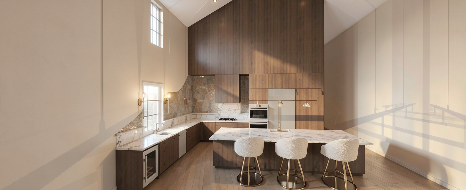 enhance this architectural image into a high end photorealistic render while preserving exactly geometry proportions volumes perspective layout openings camera position and furniture placement do not modify architecture scale composition or design intent only enhance materials lighting realism reflections micro details and photographic quality final result must be structurally identical but fully photorealistic material system definito walls main walls white matte water based paint idropittura bianca ultra fine grain soft light absorption no plastic effect floor dark wood parquet herringbone pattern spina italiana deep walnut tone satin matte finish visible wood grain slight micro bevel on planks subtle wear variation for realism soft light reflection not glossy windows frame matte black aluminum minimal reflectivity realistic sharp edges glass physically correct balanced exterior exposure slight imperfection in reflections dining area chairs matte white plastic soft light diffusion slightly rounded edge highlights table black metal structure powder coated matte finish top clear glass with realistic thickness subtle green edge tint natural reflections kitchen cabinets glossy white lacquer high reflectivity but controlled clean reflections soft rounded edges realistic handle detailing minimal or integrated tv unit matte charcoal or very dark taupe finish soft satin reflection clean contemporary look lighting engine archsynt calibration lighting mood late afternoon warm natural light sun entering from windows at realistic angle soft but defined shadows physically accurate global illumination warm sunlight approx 4500 5000k interior secondary bounce slightly warmer due to wood floor no burnt highlights balanced exposure between interior and exterior realistic shadow softness gradient subtle ambient occlusion at contact points fireplace adds warm secondary glow if visible photographic setup full frame camera simulation 30mm architectural lens equivalent very subtle depth of field real world exposure slight natural contrast neutral cinematic color grading no hdr exaggeration slight natural photographic grain editorial architectural photography feeling realism boost mandatory add micro irregularities in mineral walls subtle reflectivity variation in lacquer kitchen real contact shadows under furniture slight edge wear on parquet physically correct reflection roughness natural light falloff slight tonal shift in larger white surfaces avoid flat cgi surfaces plastic look over sharpening unrealistically perfect uniform textures atmosphere mood refined contemporary residential feeling warm elegant material driven luxury level subtle high end color tone warm neutral visual language architectural editorial realism