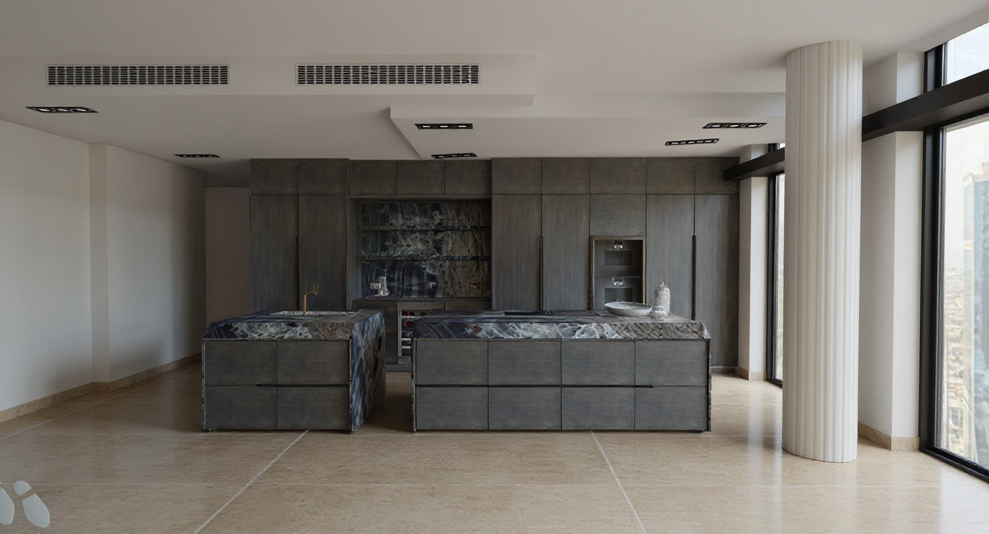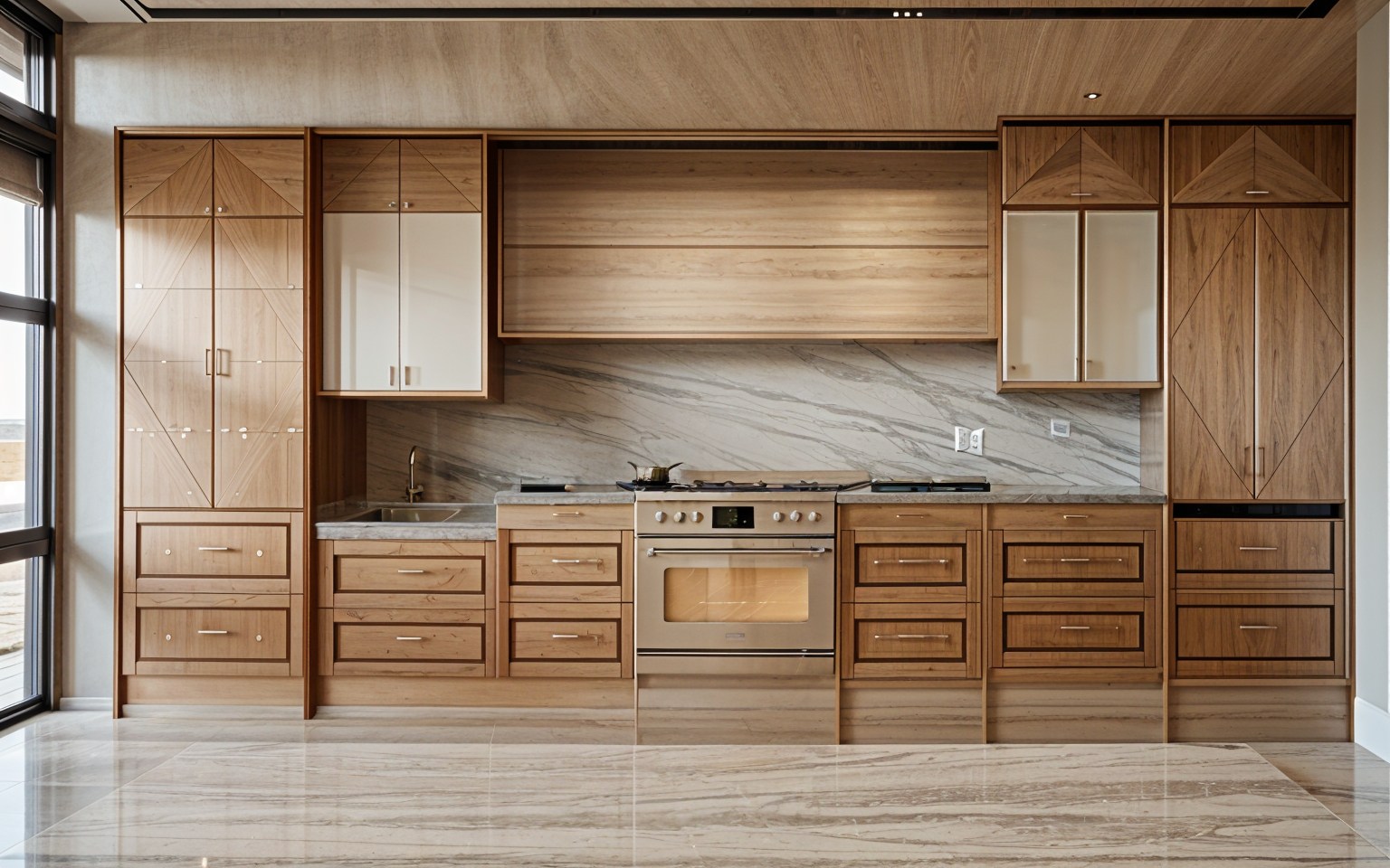 exterior shot cabinets in walnut sleek and modern stainless steel stove white plastered hood white quartz countertop and backsplash