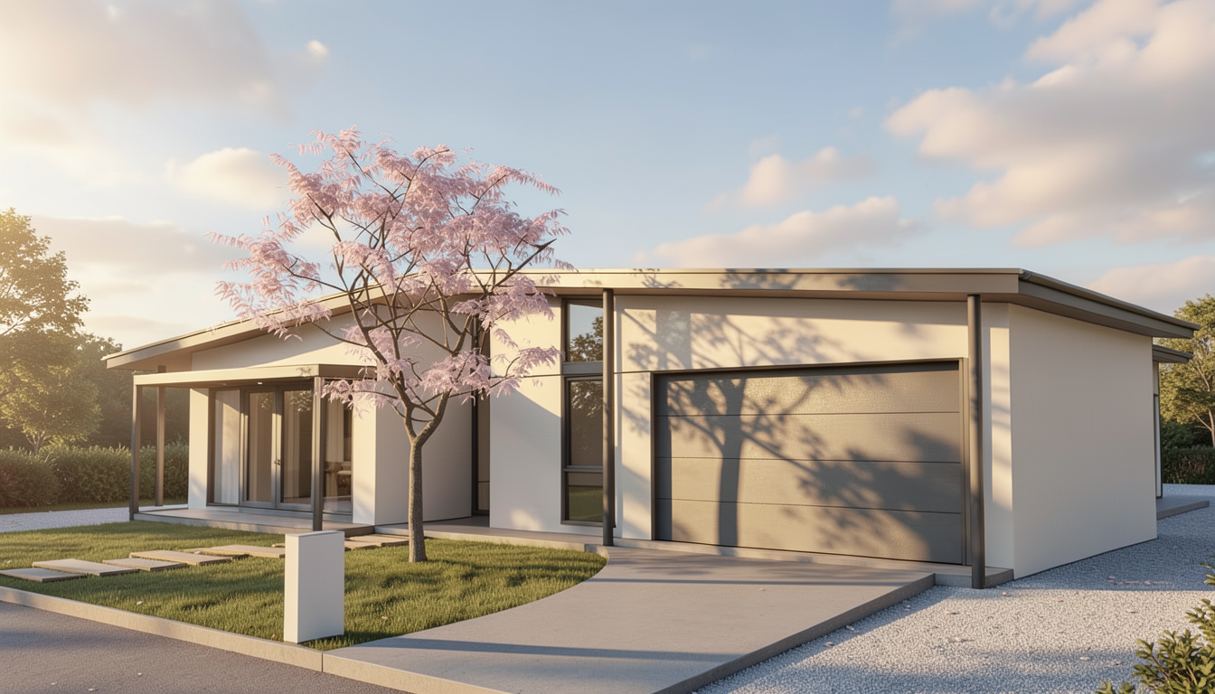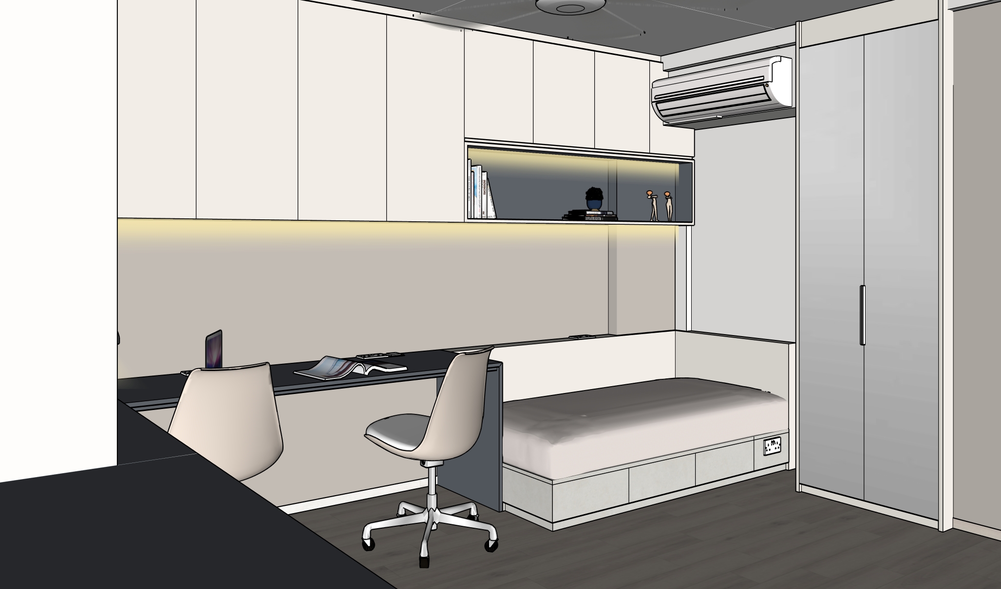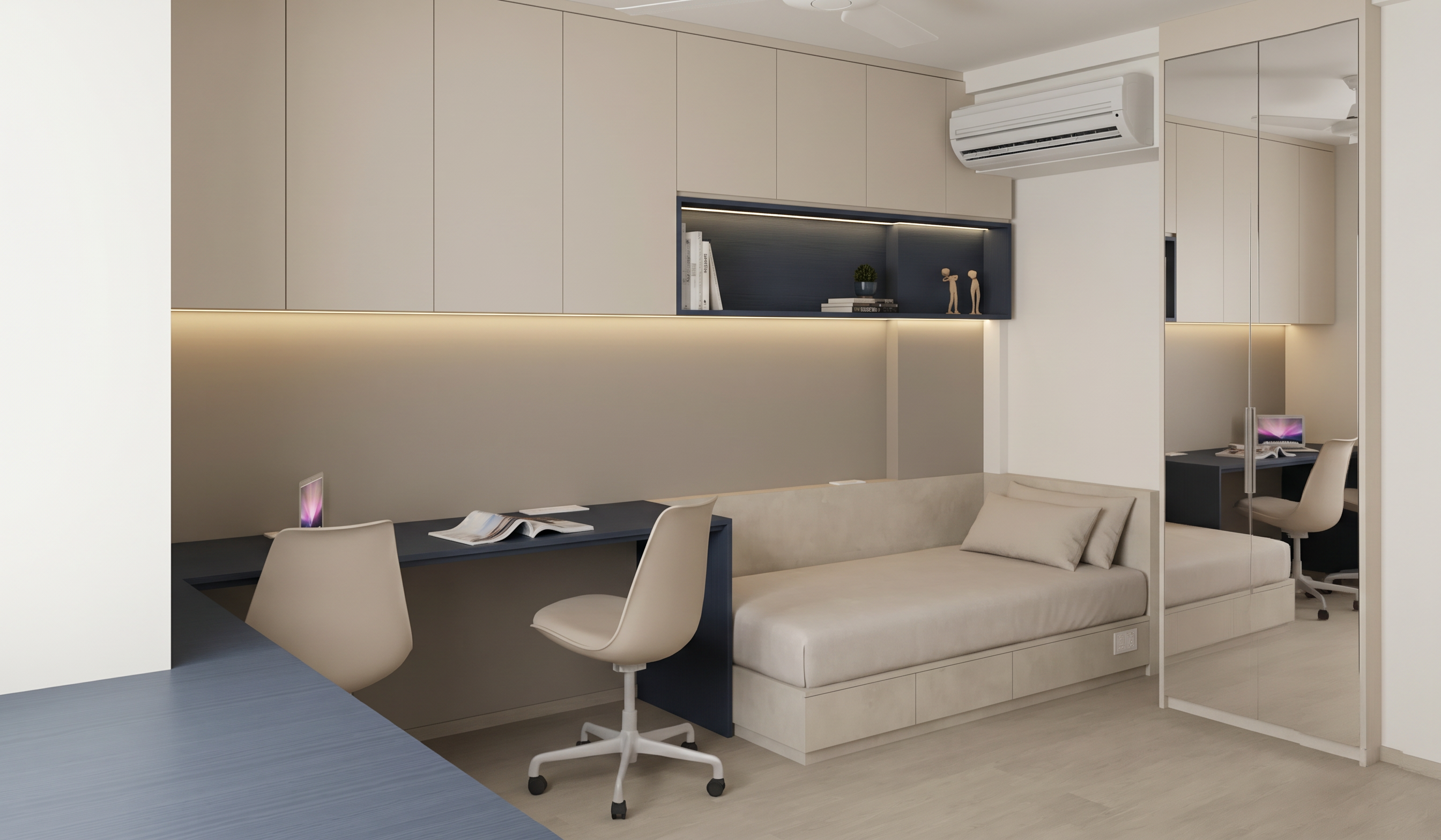 colours to remain accurate as per original given picture wood texture to be subtle niche internal and all table top surface in mid darker blue laminate moderately saturated with a grey undertone colour should appear deeper and richer but still muted not overly vibrant matte laminate texture vu finish with subtle surface grain non glossy table top surface laminate to lay horizontally top hung cabinet in solid colour light beige 2 doors full height cabinet in mirror recessed 150mm height skirting ontop only bed base in light beige microcement bed headboard in solid colour light beige ceilng in off white floor in muted light beige vinyl subtle grains ceiling fan in white 1 wall in medium neutral beige paint with a slight grey undertone muted and balanced colour should appear soft and earthy rather than yellow with a natural sand like tone smooth matte wall paint finish other walls in off white wall skirting in off white