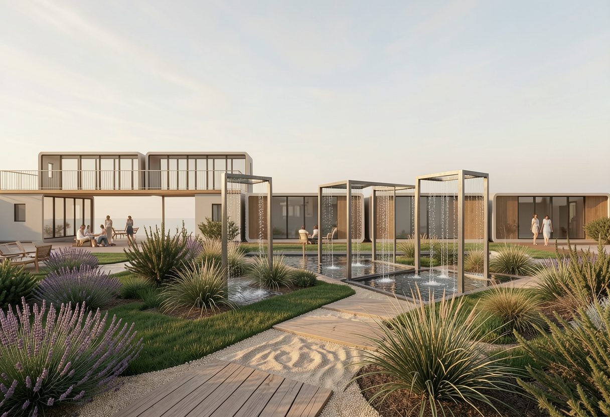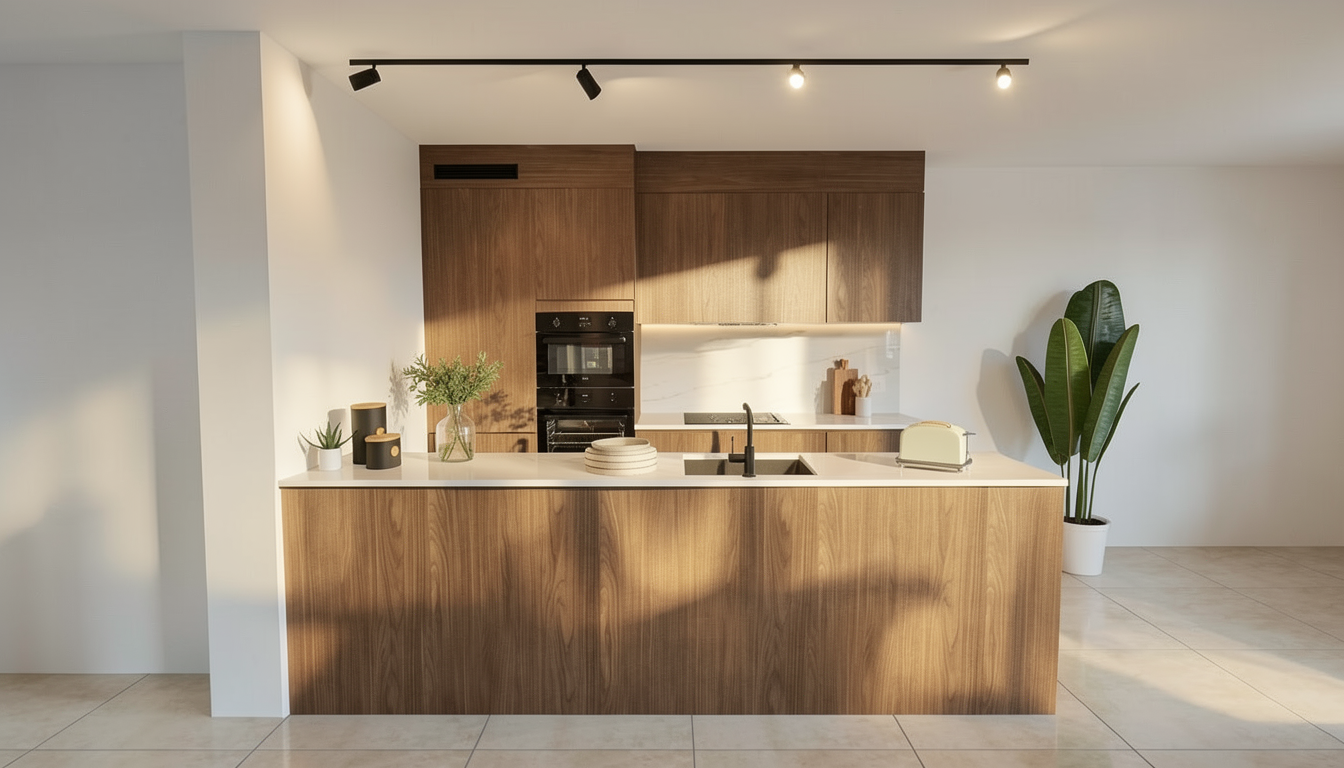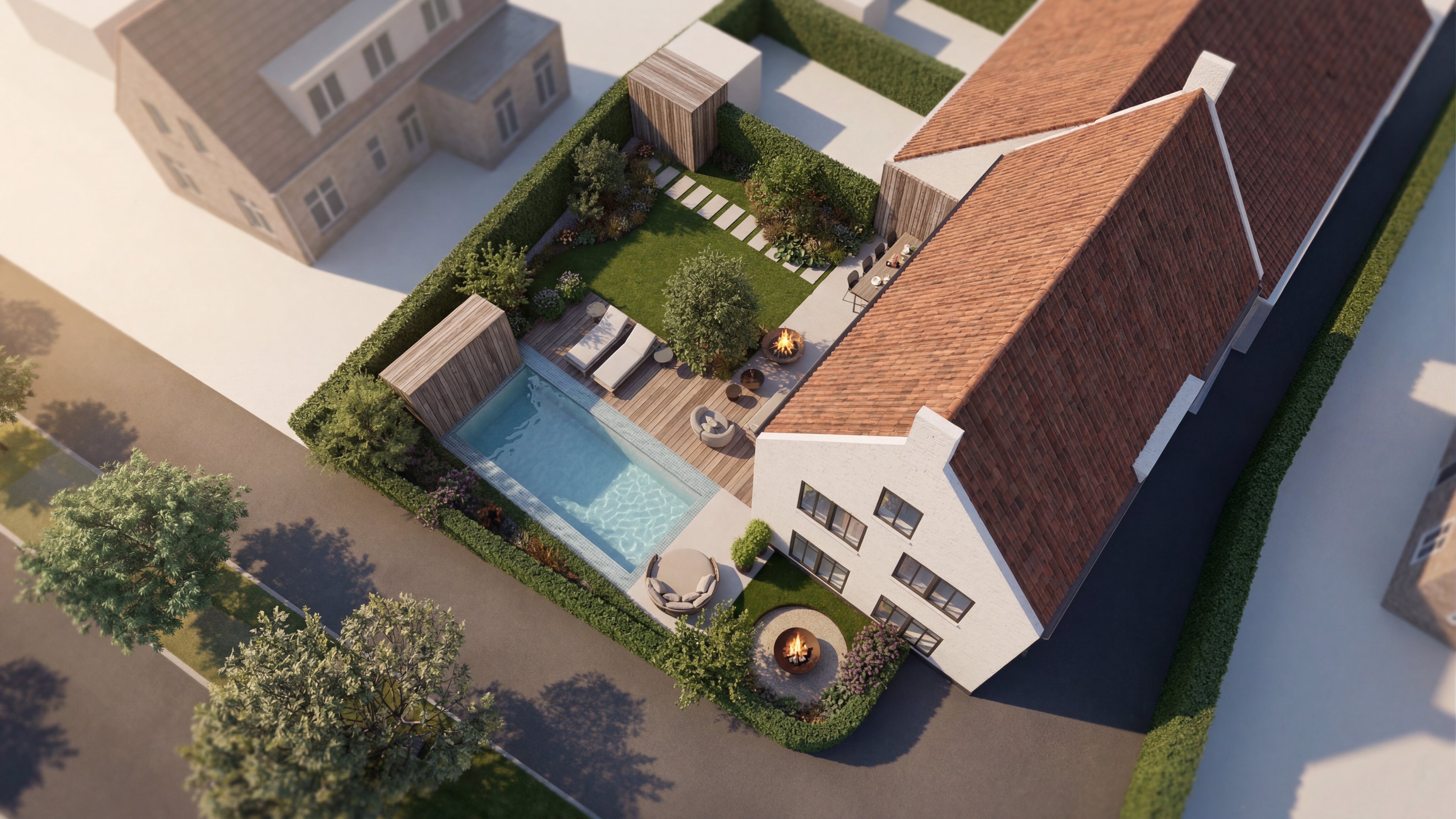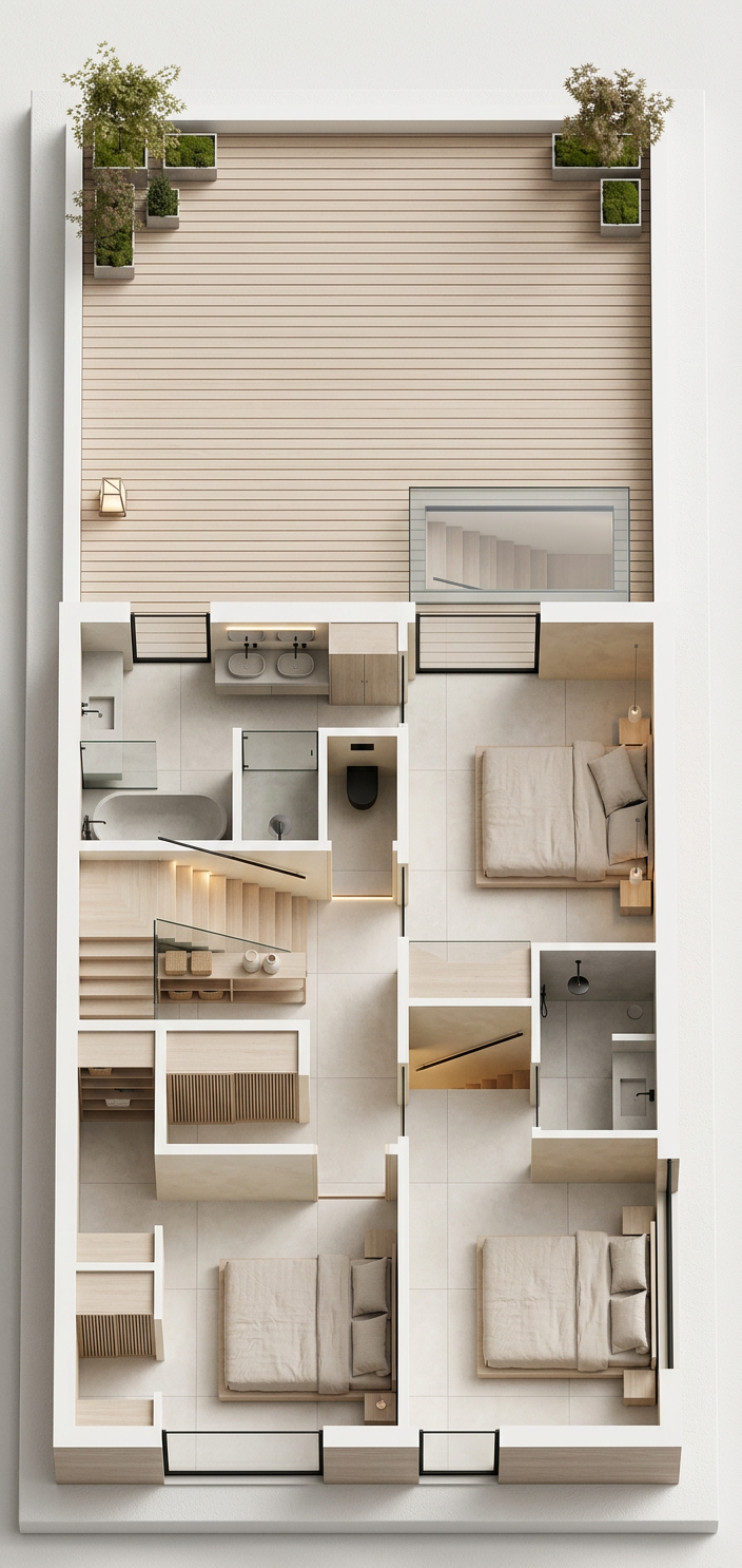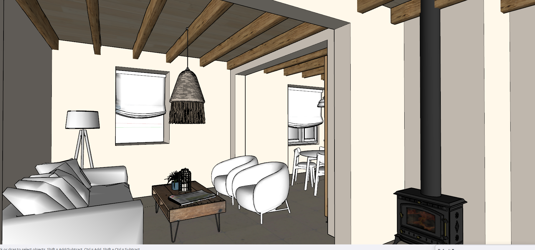 render a cozy and inviting living space featuring a rustic wooden ceiling with exposed beams in natural oak brown use soft cream for the walls and a light beige for the flooring style the room with a sleek white sofa adorned with plush white cushions include a contemporary tripod floor lamp in a silver finish position a wooden coffee table with a rich walnut finish at the center topped with decorative plants and elegant magazines display modern rounded armchairs in a pure white incorporate a black wood burning stove with a visible warm glow from the fire add a woven pendant light in earthy tones casting a gentle warm illumination infuse the room with a serene and relaxed atmosphere