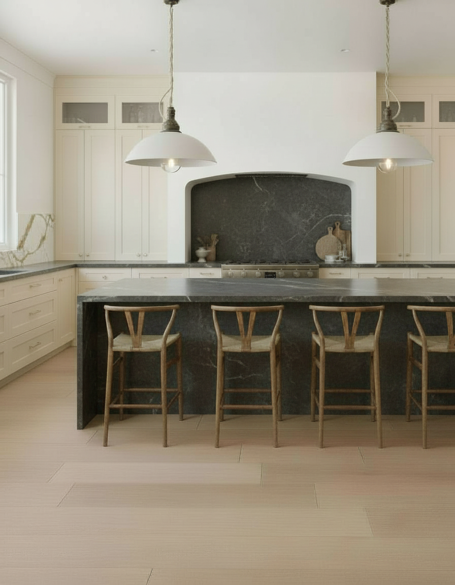 give the under side of the island have a dark brown ridging also make the other backsplash by the window the same color as the countertops