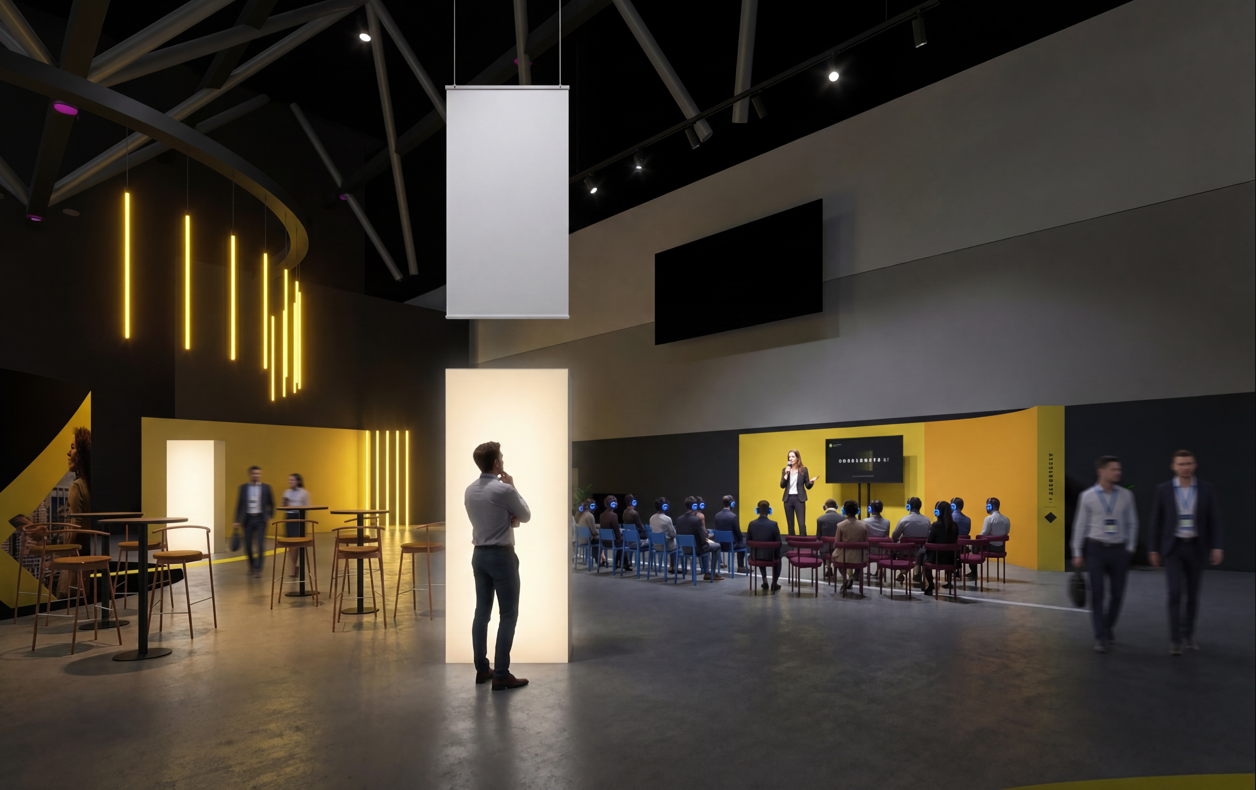 a modern exhibition hall with soft dark lighting vertical bars illuminated by glowing yellow neon lights on the left only smooth dark grey concrete black rectangle is an overhead banner hung by string replace yellow rectangle near the front with soft glowing light box have a person looking at the box woman business female presenter on stage with microphone audiences with glowing blue headphones only blurred business people with lanyard walking past