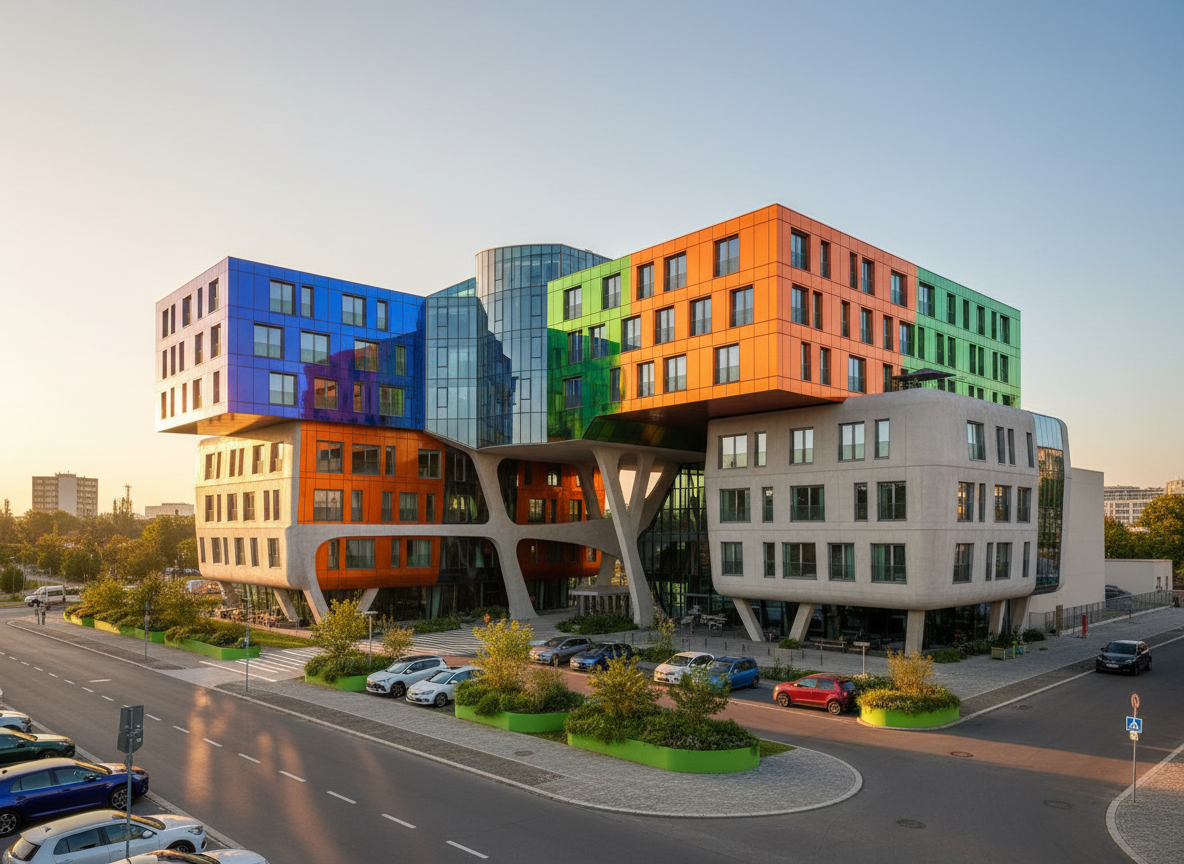 in colore verde il giardino in colore grigio i parcheggi l edificio centrale ha due piani