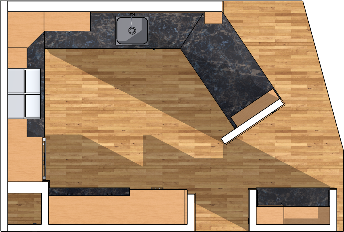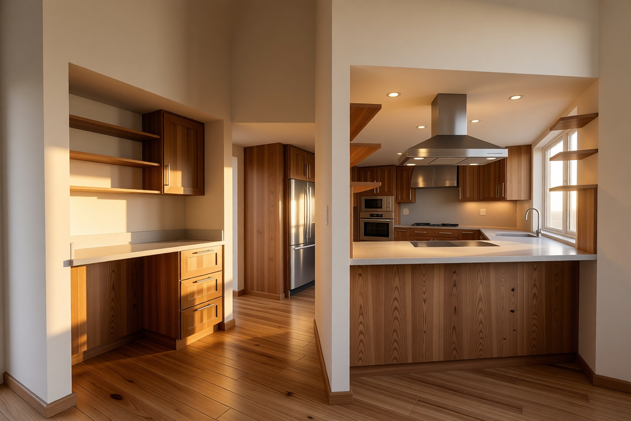 modern craftsman kitchen dark stone marble countertop maple floors medium tone wood cabinets with soft sunset lighting coming from the right east