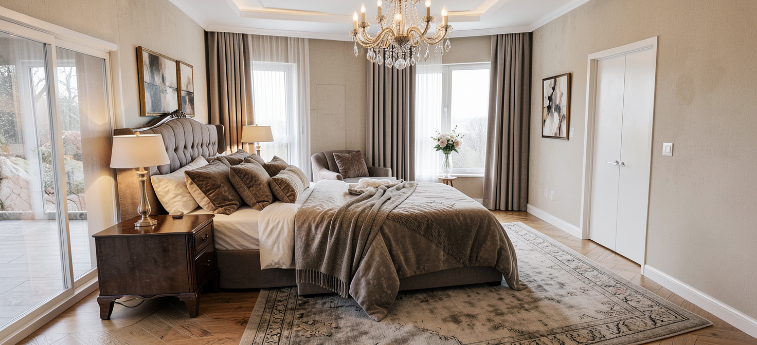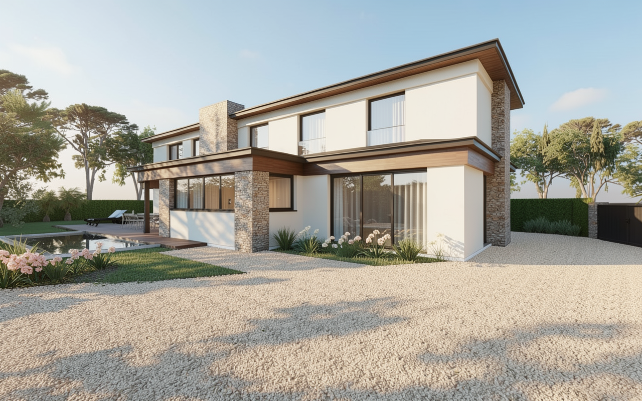 create a highly photorealistic high end architectural visualization with an emphasized inviting cozy atmosphere preserve the existing dusk setting and golden hour highlights on the brick facade including the warm glow from all interior windows and the upward downward exterior wall sconces enhance the cozy feeling by slightly intensifying the warm tone of all light sources making the interior spaces appear even more deeply lit and welcoming and creating a soft almost diffused quality to the evening light ensure textures like the brickwork and wood are rendered with extreme detail maintain all scene elements the seating area with cushions and the garden layout