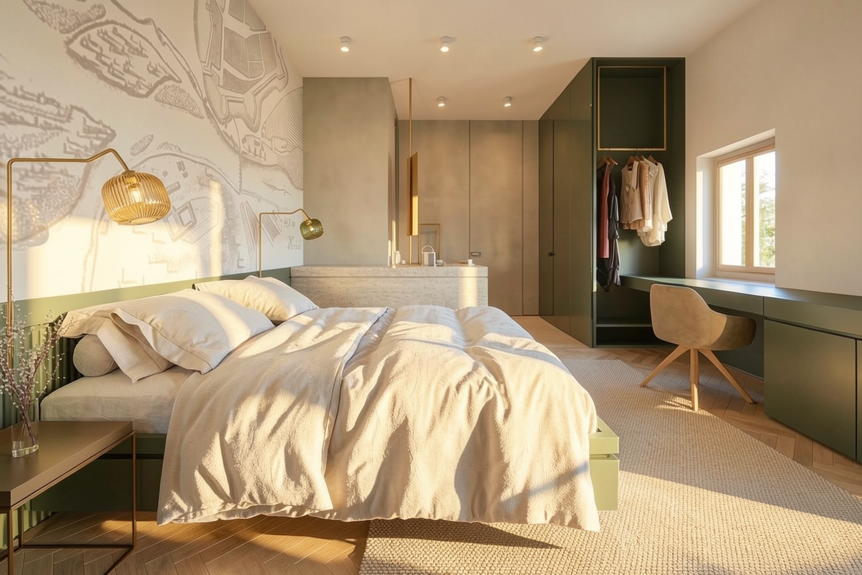 keep same interior design same materials and colors same furniture and lighting put some books on the shelves shelf above the bed shallow in white color keep all walls and ceiling white