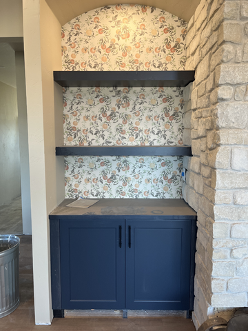 do not change the cabinets in any way preserve the exact cabinet colors materials finishes dimensions door and drawer styles hardware spacing alignment and all geometry exactly as shown do not alter the countertop shape backsplash appliances flooring lighting fixtures or wall structure only remove the construction materials clutter and mess from the scene clean the room and make it look finished and staged add a few simple tasteful home accessories appropriate for the style of the space but do not add or remove any furniture windows or architectural elements maintain the original lighting direction and realism enhance clarity and polish the photo while keeping the cabinetry and room design completely unchanged do not alter the lighting to keep the cabinet colors as they are in the image stage for a great room add toe kick to the cabinets do not change the color of the cabinets top or shelves