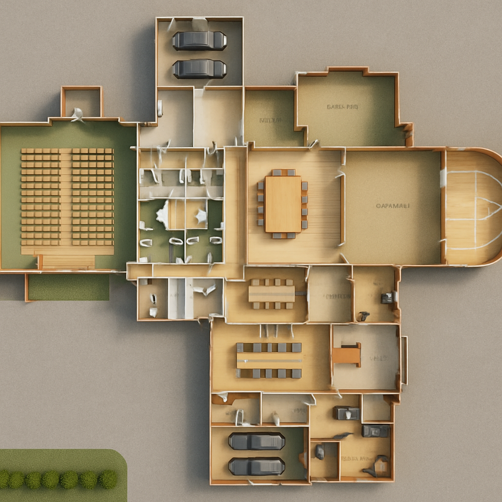 conference room for landscape design firm remove the second row the highest set of wooden shelving so that there is one level of shelving remaining stain the remaining wooden shelving darker add stone samples turf samples lighting samples and photos of past projects into the shelves remove the green and yellow storage rack remove the black furniture remove the single wall where the plywood is replace this with a cable railing and open concept add dark wood flooring paint the walls blue add a tv stand smartboard add a conference table with carpet and light leather chairs