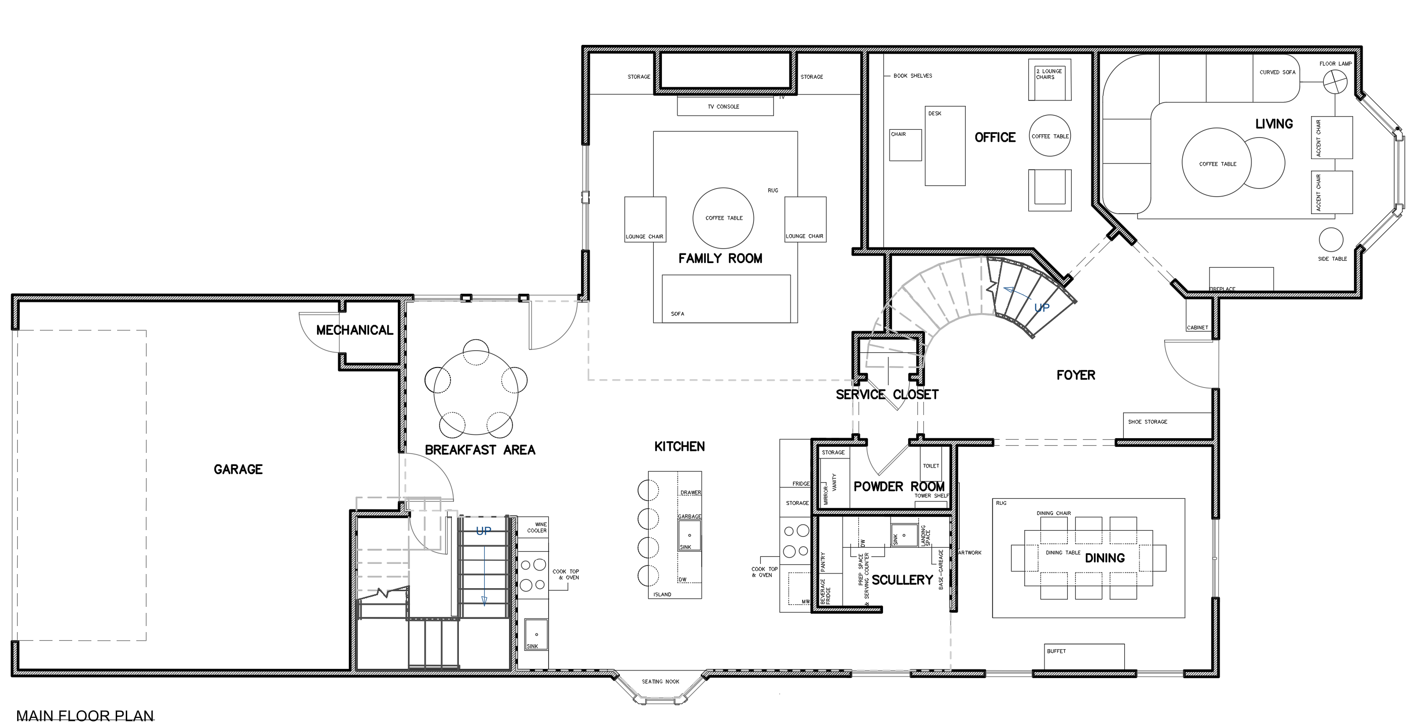 interior shot rendered architectural floor plan in a sketchup model style top view maintain the exact layout wall positions door openings and room proportions from the original floor plan use black architectural walls with clearly visible door swing arcs to show door opening directions light oak wood flooring for all main interior spaces including the family room living room office dining room breakfast area foyer and kitchen the scullery and powder room should have light gray tile flooring the garage on the left side should have a gray concrete floor and remain empty with no furniture simple furniture layout similar to a sketchup model presentation clean architectural floor plan visualization with flat lighting and no shadows architecture