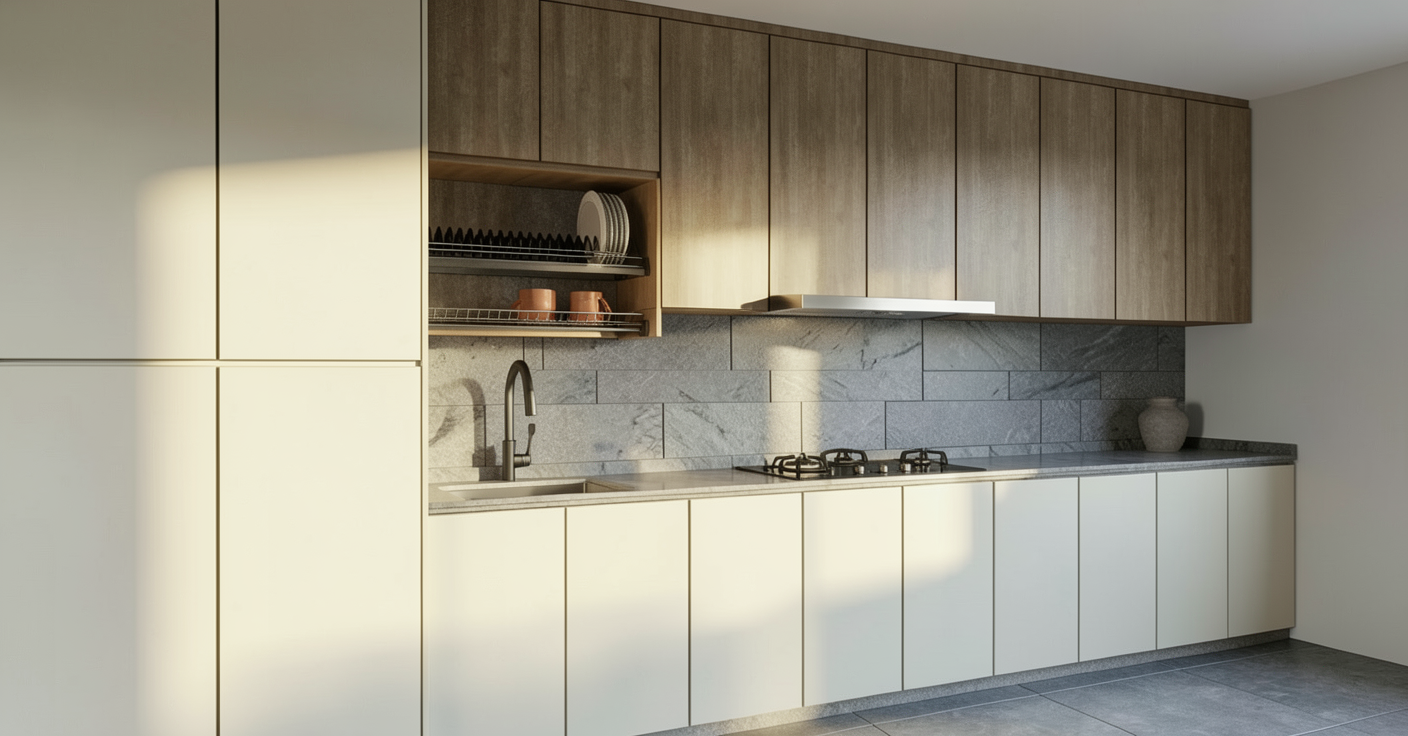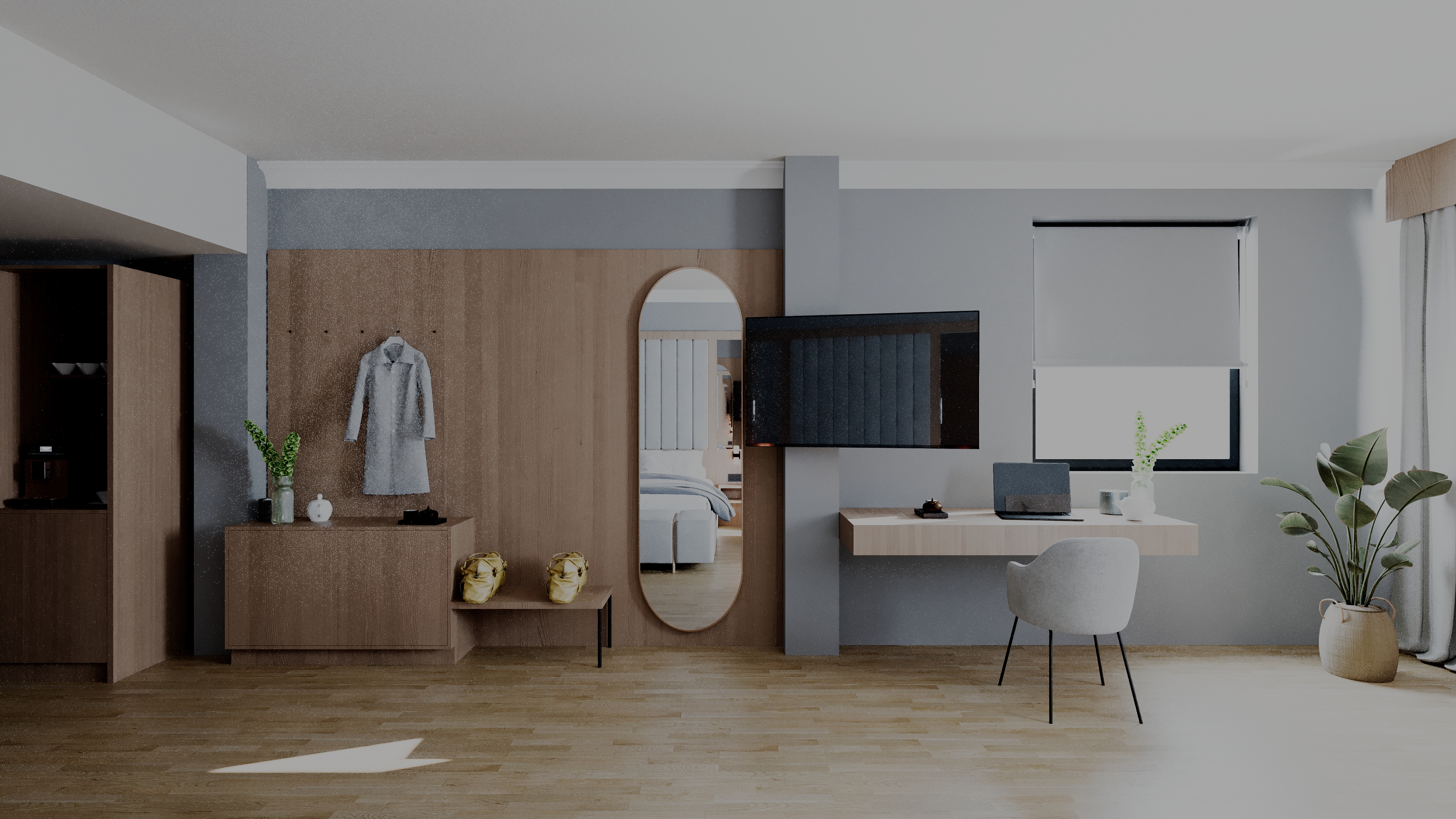 ultra photorealistic render of this exact interior scene do not change the design layout camera angle proportions furniture placement wall panels mirror shape tv placement desk chair window curtains or overall concept keep everything exactly the same the wood material is oak veneer only not walnut all wood surfaces on the wall panel wardrobe cabinet bench and floating desk must be rendered as natural oak veneer with a refined warm tone subtle authentic oak grain soft tonal variation and a premium matte finish the texture must be seamless high resolution and realistic with proper veneer direction and clean joinery make the oak veneer look truly natural and high end with visible wood pores and believable material depth do not make the wood dark like walnut floor must remain light natural oak parquet realistic plank variation and premium finish walls remain soft warm light grey with smooth painted texture mirror glass realistic with natural reflection and depth tv screen realistic with subtle reflections not flat black chair fabric realistic and soft premium upholstery texture roller blind and curtains must look more natural elegant and realistic with soft folds plant should look real and fresh keep accessories minimal and refined no clutter no extra furniture make the whole render much more realistic improve lighting quality and natural daylight from the window add realistic shadow depth and contact shadows improve ambient bounce light and overall contrast remove cg noise and grain sharpen material definition without making it look artificial improve realism of wood veneer fabric painted walls glass and floor add subtle imperfections and micro details so it feels like a real photographed interior not a cgi image the final result should feel like a high end luxury hotel or premium residential interior photograph with clean styling realistic daylight and highly believable oak veneer materials important oak veneer only not walnut and do not redesign or move anything only enhance realism and material accuracy
