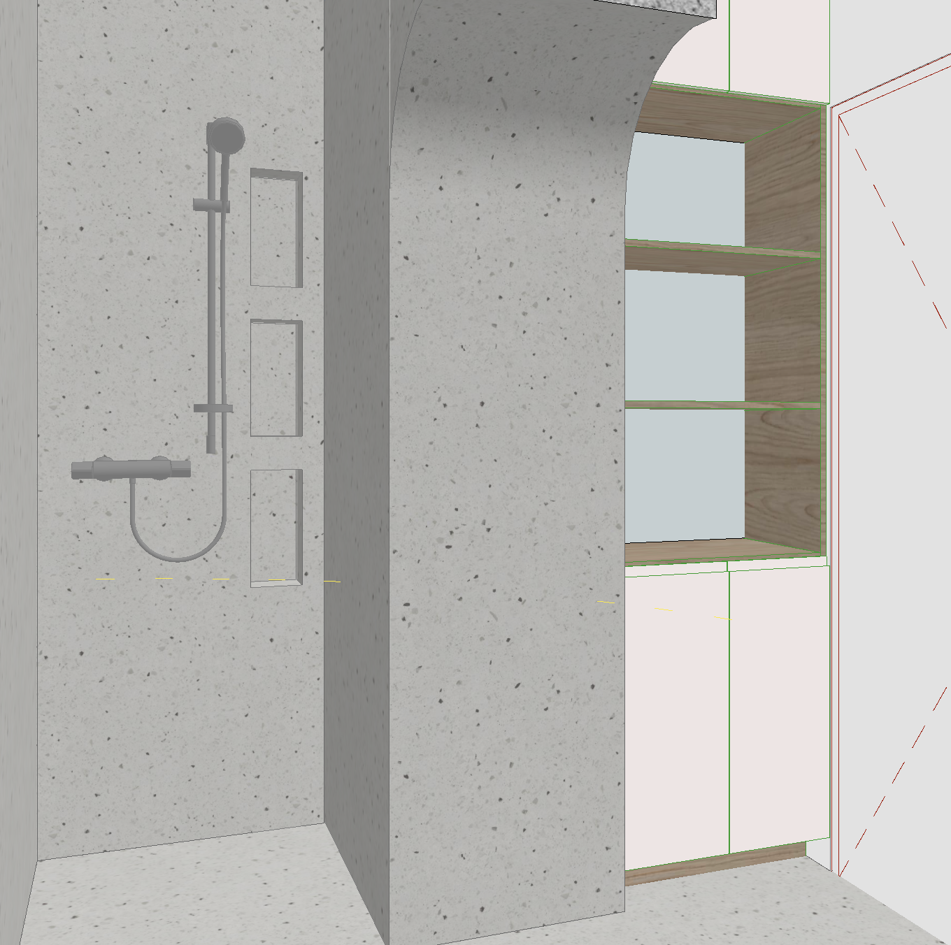 a modern minimalist bathroom with smooth concrete walls in a light gray tone creating a sleek atmosphere the thick wall devides a shower and storage cabinet that storage cabinet has a wooden framed mirror in the middle with 2 shelves in front the overall mood is calm and sophisticated with a focus on simple elegance and functionality soft diffused lighting enhances the tranquil environment highlighting the natural textures and materials