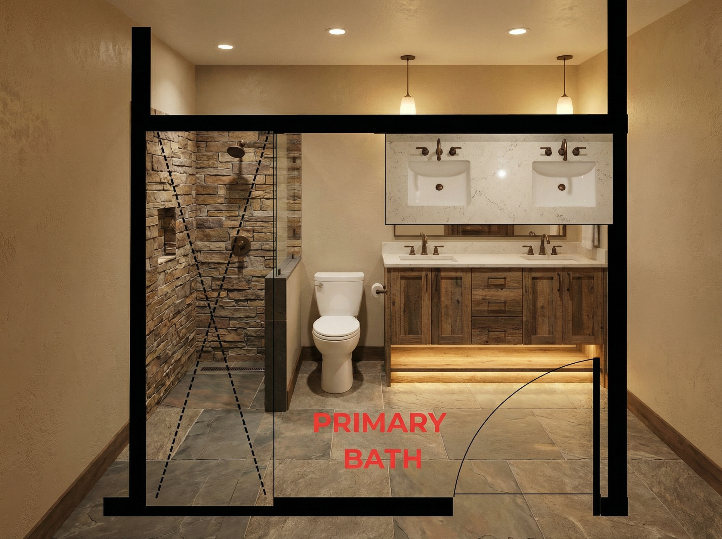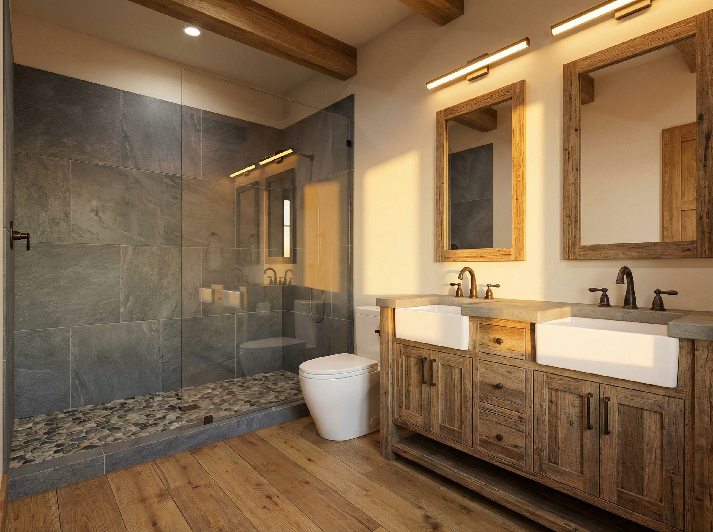 render this bathroom layout make the vibe warm and modern colorado style