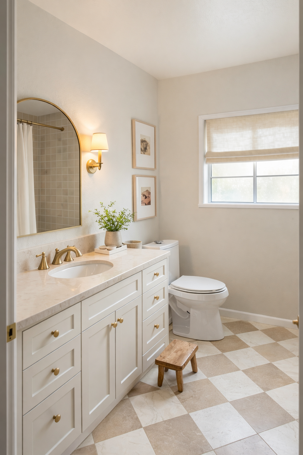 fix the flooring under the stool to be one piece of the darker brown tile like the rest of the photo