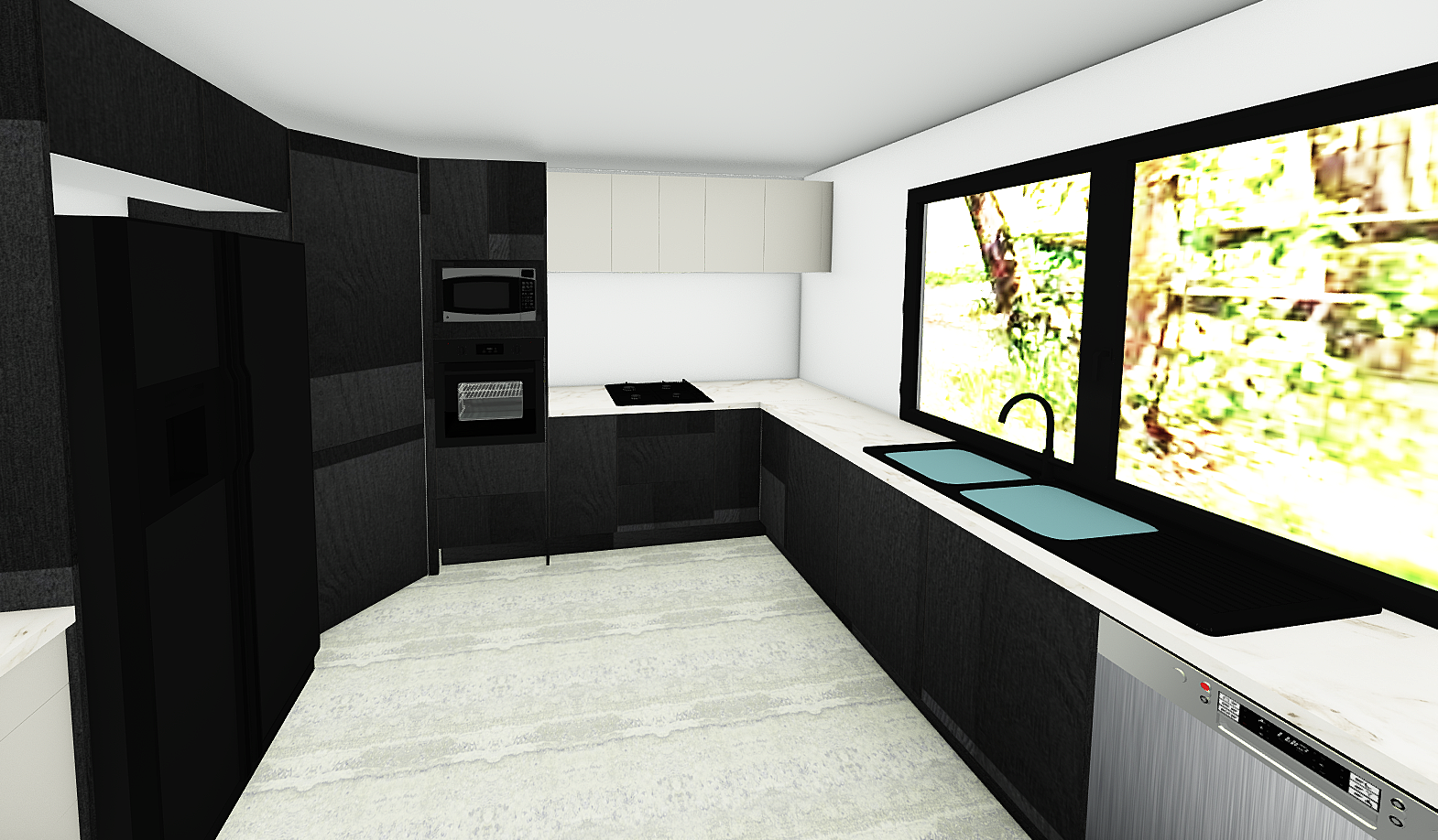 better view to a backyard from the window timber is black travatine floor tiles and splash back copper sink