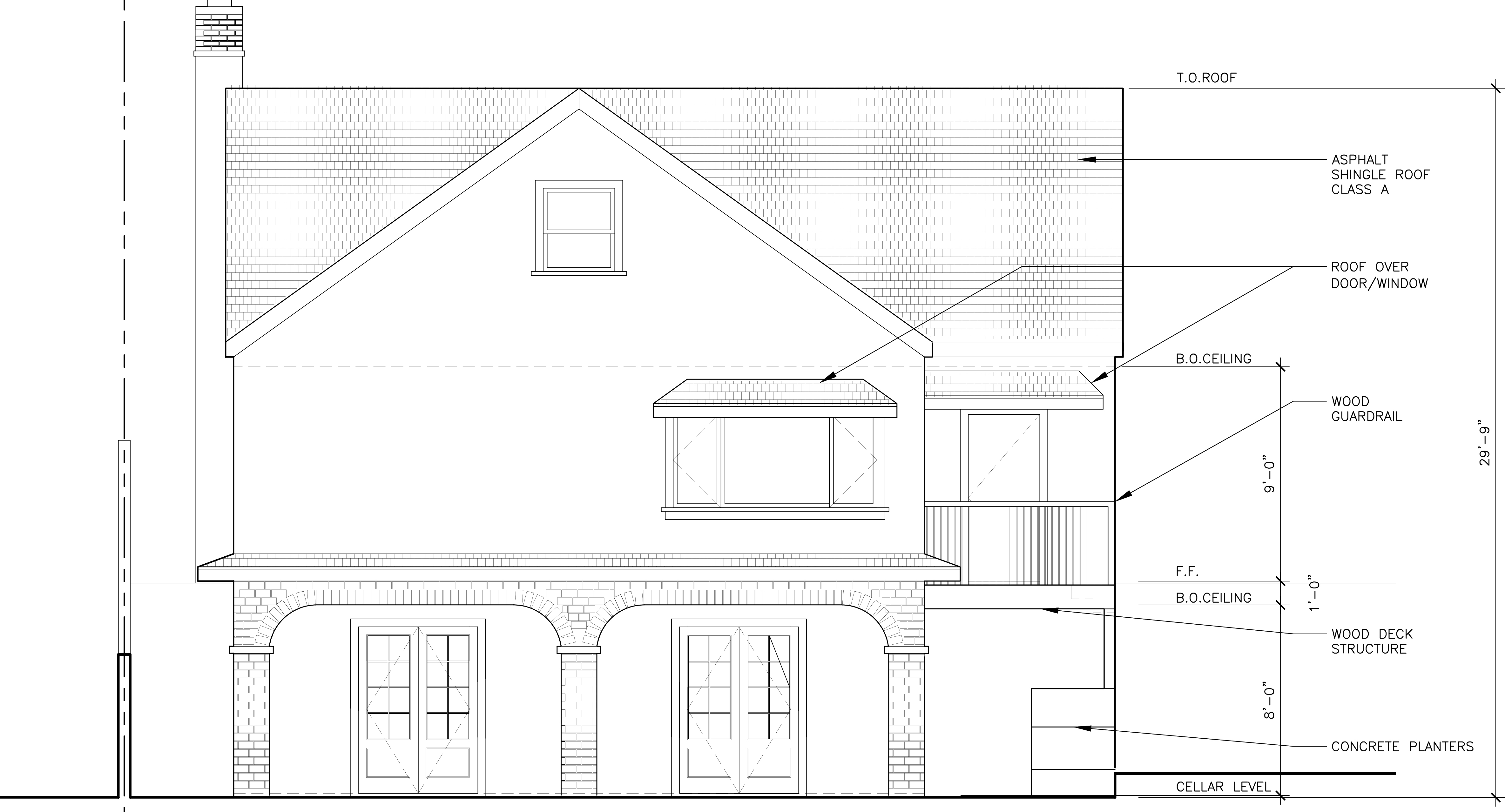 this is a backyard view of a house on a hillside where the back of the house is lower than the street level by 7 feet the roof is redish brown asphalt shingles warm white stuco walls warm brick arches are in front of the wall making for a small patio space beyond the bring arches windows are sage green colored frames there is a wood deck on the right side with a wood guardrail and planters below the yard should have california native plants and flowers with a bouganvia growing next to the house