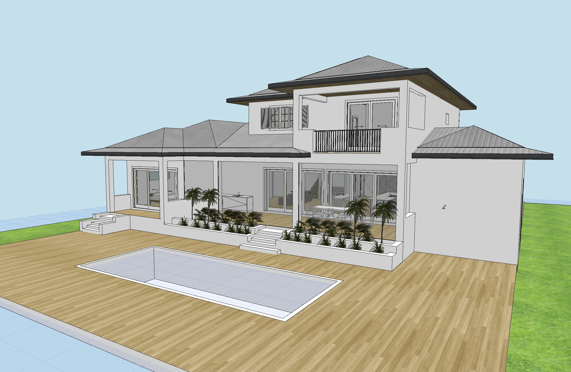 please render this to look photorealistic add some small florida plants in the staggered long liner planters do not add additional planters