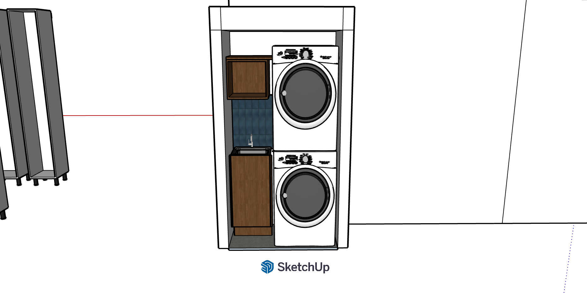 create a realistic render for this interior deisgn european laundry include lighting and materials make the blue backsplash tiles glossy they re the babylon blue gloss crackel tile from beaumont stiles the floor tiles are a neutral gray coloured large face tile this laundry room is in a hallway horizontally