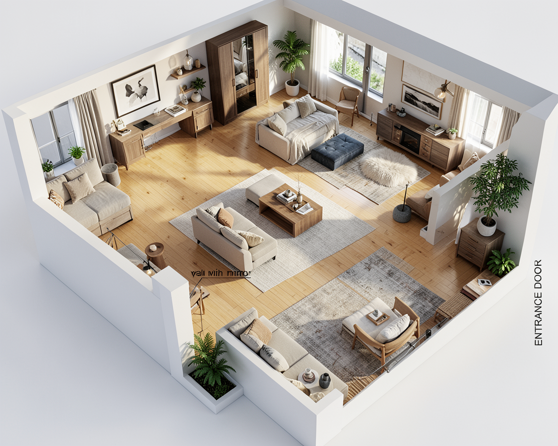 image type hyper realistic architectural render contemporary editorial style scene framing frontal orthogonal street level view of a modern mediterranean house symmetrical and centered composition with a calm balanced architectural reading camera at human height approx 1 60 m neutral lens 35 50mm no perspective distortion main elements single cubic residential volume with white stucco surfaces a vertical natural stone wall element dark vertical slatted gate and a recessed wooden entrance door upper floor with large window and glass railing one contemporary car parked to the right mediterranean vegetation olive tree low shrubs climbing plant on wall keep existing elements only foreground includes asphalt road and cobblestone pavement materials critical high fidelity asphalt uniform and continuous surface fine grain texture no visible noise or patchiness matte finish no reflections cobblestone pavement clear definition of individual stones subtle joints slightly irregular but controlled pattern matte and slightly porous natural tones low saturation white stucco perfectly consistent surface no imperfections or stains very subtle micro roughness only visible under grazing light clean and controlled finish natural stone wall horizontal layered stone warm beige tones soft shadowing between layers controlled relief no excessive contrast wooden door natural wood tone matte finish soft grain visible but not exaggerated black slatted gate matte black deep tone no plastic reflections glass soft reflectivity balanced transparency vegetation mediterranean vegetation with realistic volume and structure olive tree with slightly irregular canopy grey green leaves and ground cover subtle light interaction soft shadows healthy but restrained do not add or densify vegetation lighting mid afternoon mediterranean light warm lateral sunlight casting elongated but soft shadows across the fa ade and ground clear summer atmosphere with a subtle sense of heat no overexposure controlled highlights environment background clean background with soft mediterranean context suggest distant gentle slopes and sparse vegetation very subtle and not competing with the architecture no dense forest color atmosphere warm natural tones slightly desaturated clean whites controlled contrast air feels dry and luminous avoid oversaturation and avoid heavy color grading style editorial architectural photography poetic calm highly visual inspired by high end architectural publications minimal elegant no artificial drama quality ultra realistic high resolution physically accurate materials pbr clean global illumination no noise no artifacts restrictions do not add new elements do not exaggerate textures do not oversaturate colors do not burn highlights avoid dramatic skies or overly stylized effects the sun light comes from the left side