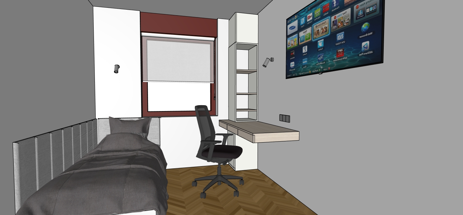 sleeping and working room for child single bed from the left side and in l shape upholstery on the wall working corner includes table with drawers under the working surface in very pale wood decor put some books and decoration for child room on the working table from the left side is cabinet with open shelves back sides top and bottom in warm white opaque color and shelves in same wood decor as a working top above the open shelves is cabinet with door in warm white opaque decor close the door put some books and decor inside tv on the wall wall lamps above the working table and above the bed pillow all white walls window and box above window in dark brown color