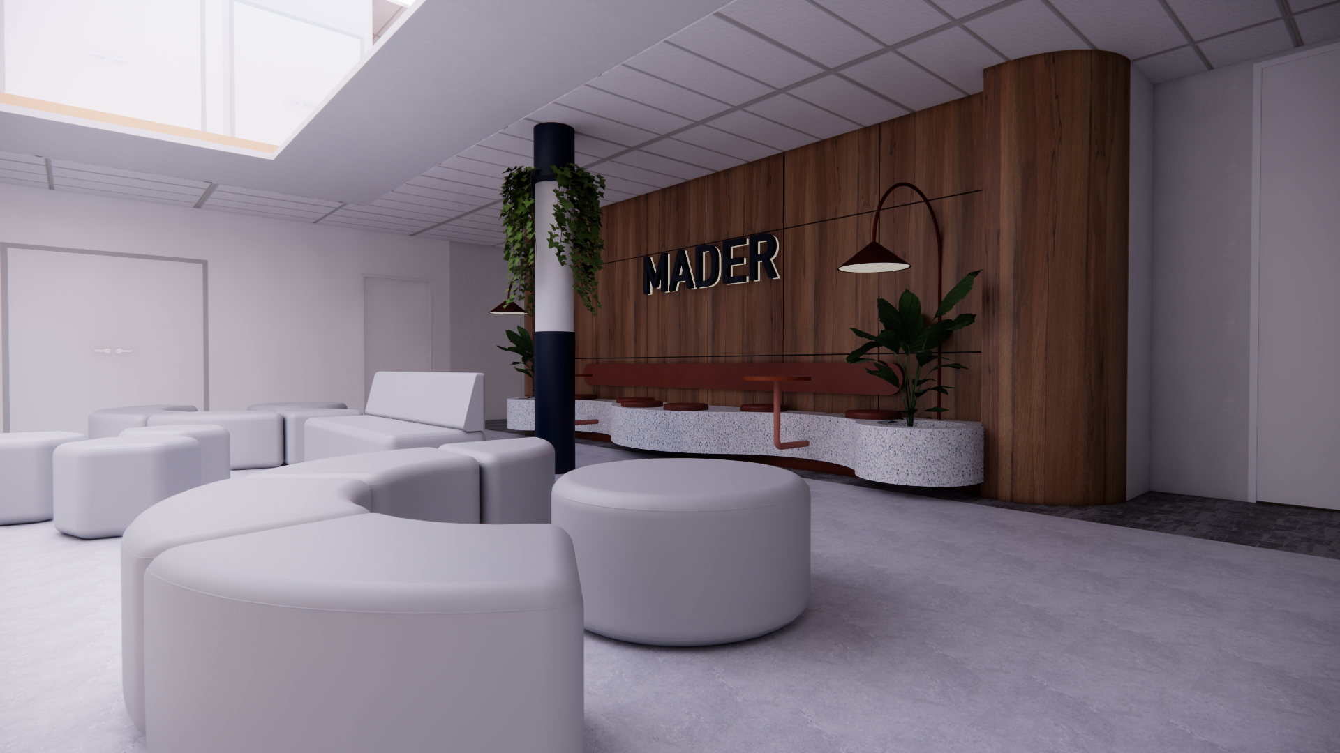 photorealistic enhancement only do not modify any colours textures or materials in the space except for the sofas maintain the original finishes exactly as shown flooring walls joinery stone ceiling and all existing furniture improve realism high resolution accurate shadows soft ambient artificial lighting realistic reflections and refined material detail update the sofas only change upholstery to a mix of light grey and navy blue subtle navy not glossy keep the sofa design shape placement and proportions unchanged add troffer lights integrated into the existing grid ceiling aligned cleanly within the ceiling grid layout with realistic illumination not overly bright add a glass balustrade to the upper floor edge void area above using clear glass panels with silver chrome fittings silver posts clamps or slim top rail keep the fittings minimal and modern ensuring the balustrade integrates naturally with the existing architecture and remains realistic without excessive glare or reflections