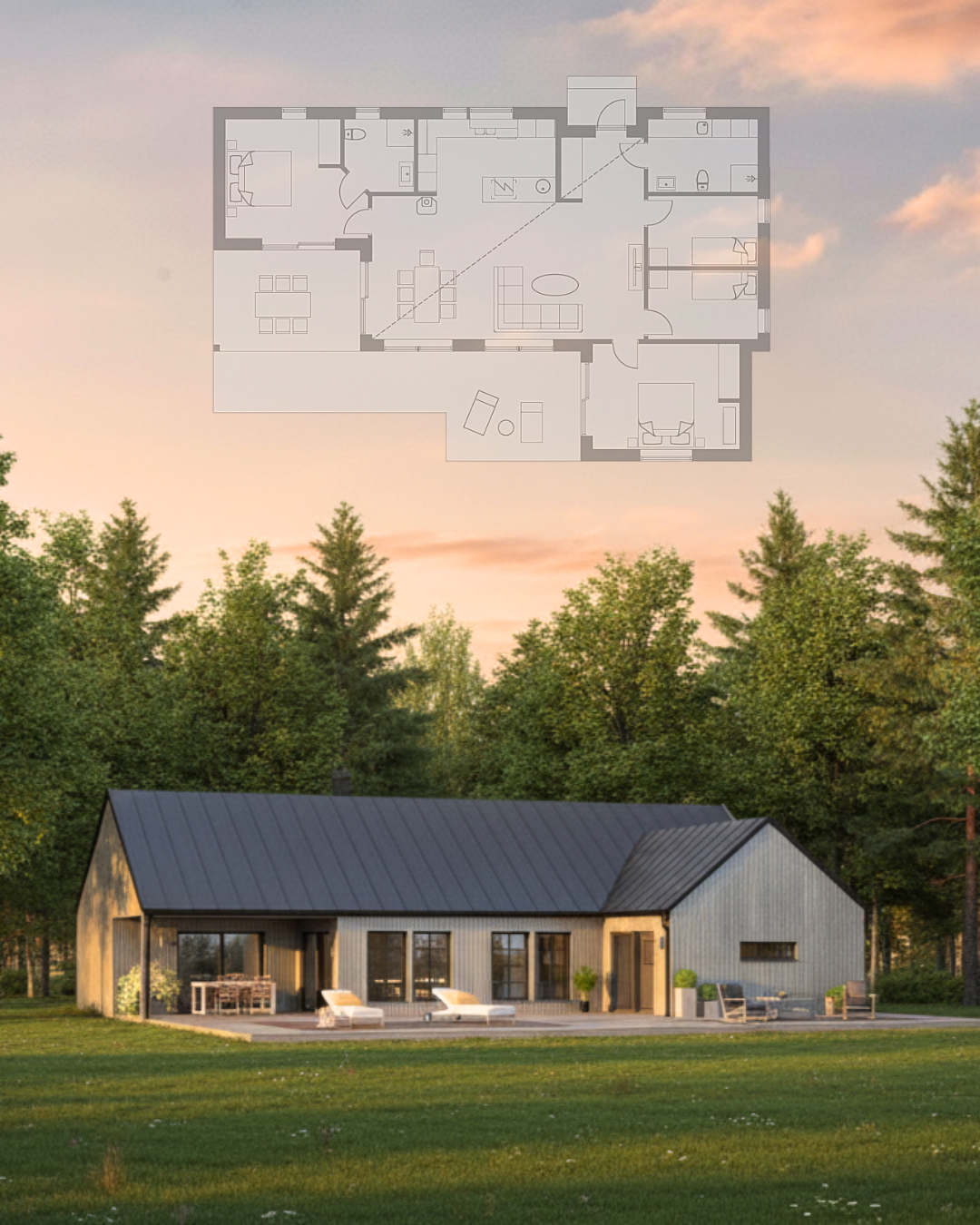 add a subtle overlay of house floor plans in light gray creating a seamless blend with the serene landscape dont change anything about the house