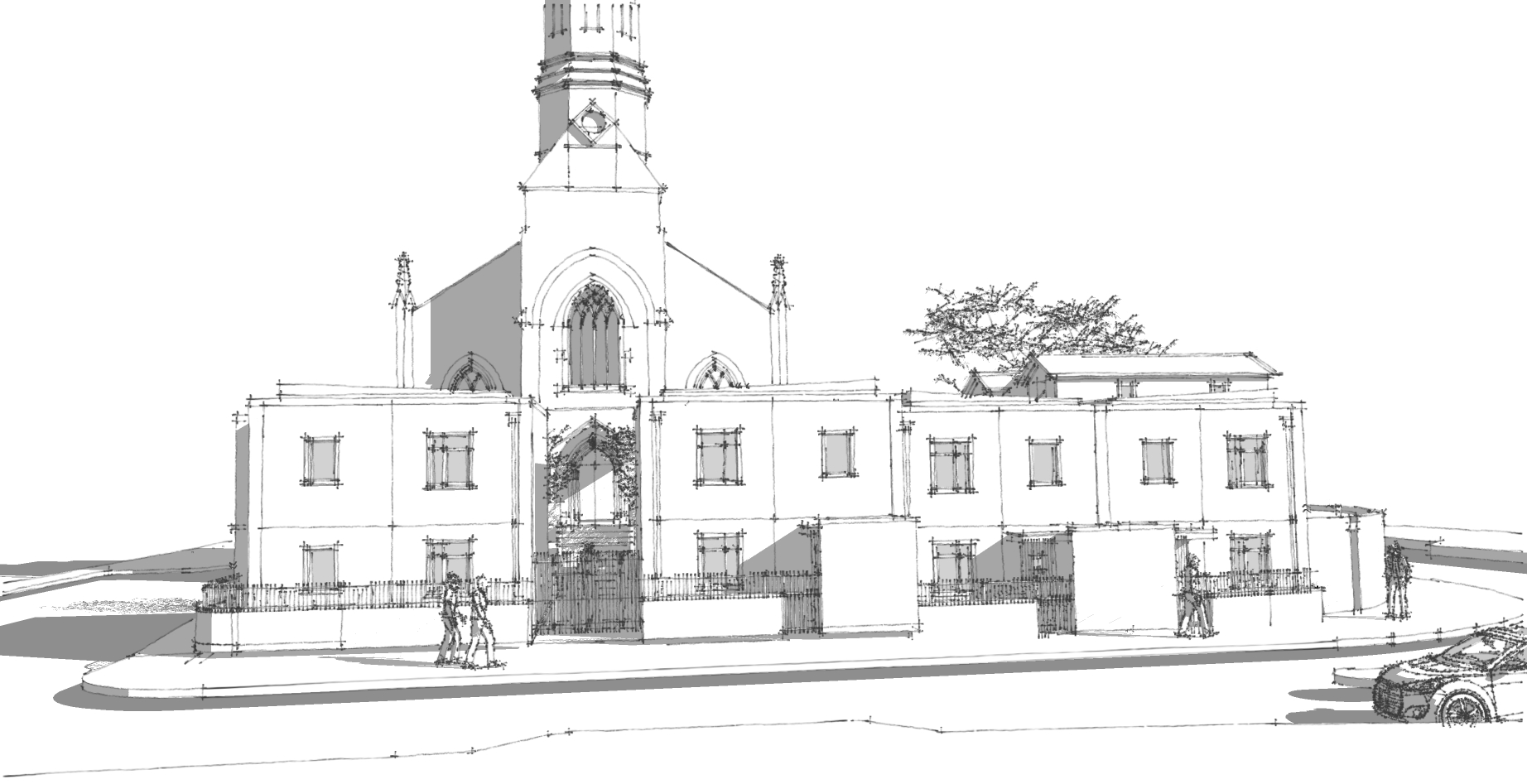 render image white rendered walls in foreground pennant stone to church in background
