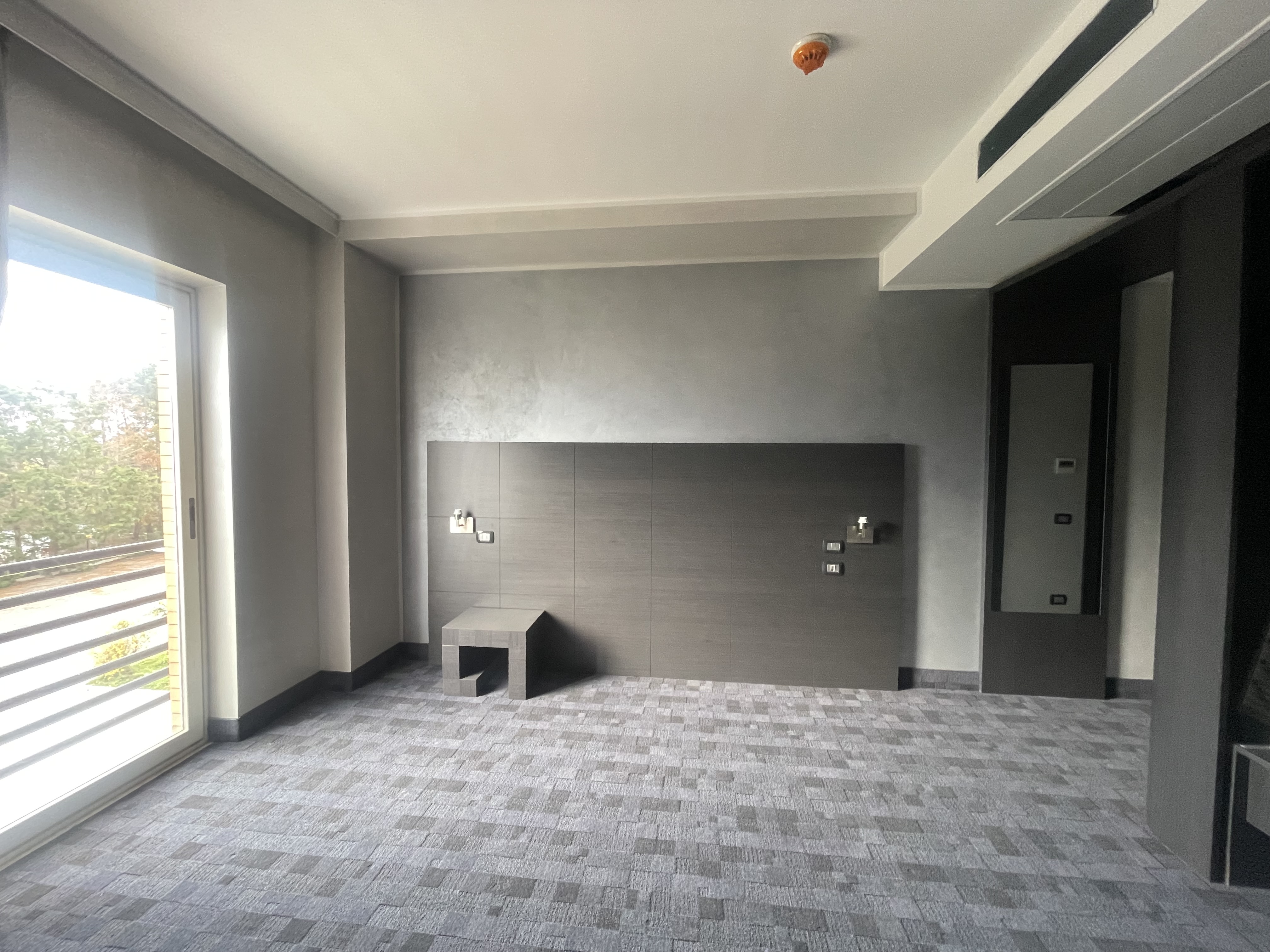 mantieni i colori delle pareti e del pavimento esistenti inserisci due letti singoli colore bordo grigio mantieni testata esistente invece della cassettiera inserisci una scrivania dello stesso colore