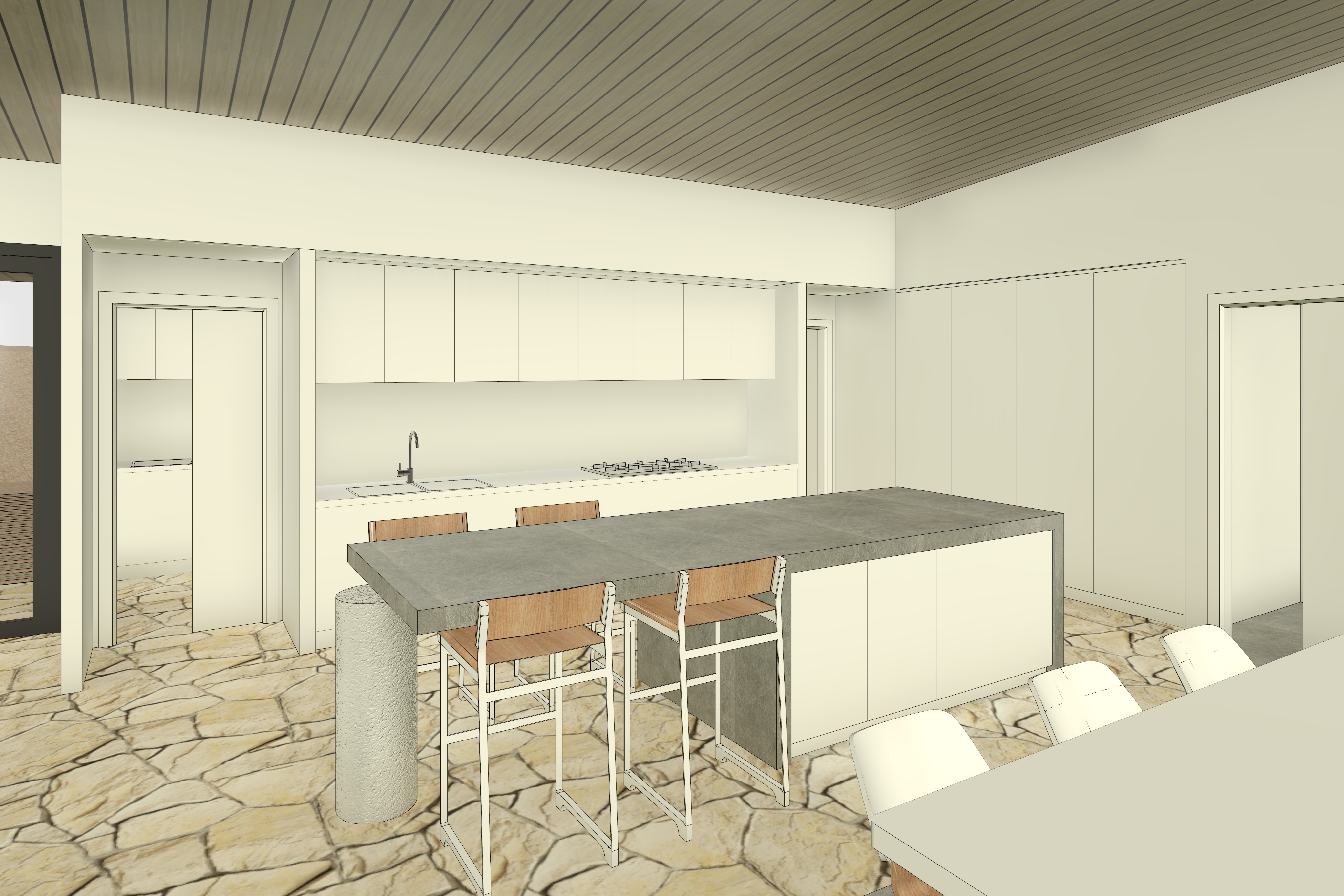 keep exact geometry of original image internal of a living dining kitchen area of a residential home floors are burnished concrete with a feature portion of crazy paved stone through the kitchen with an organic edge divide grey fabric couch with timber frames grey woven rug grey fabric chairs black window frames timber ceiling lining all timber to be color matching native australian feature coastal banksia trees where visible decking outside windows to the right grass farmland beyond deck surrounding house with distant bay water views down hill partly cloudy sky with warm bright mid morning sunlight from the right hand side on a fall day kitchen to the left hand side with concrete benchtop and support concrete bench top in kitchen full height white door into walk in pantry on right hand side of image