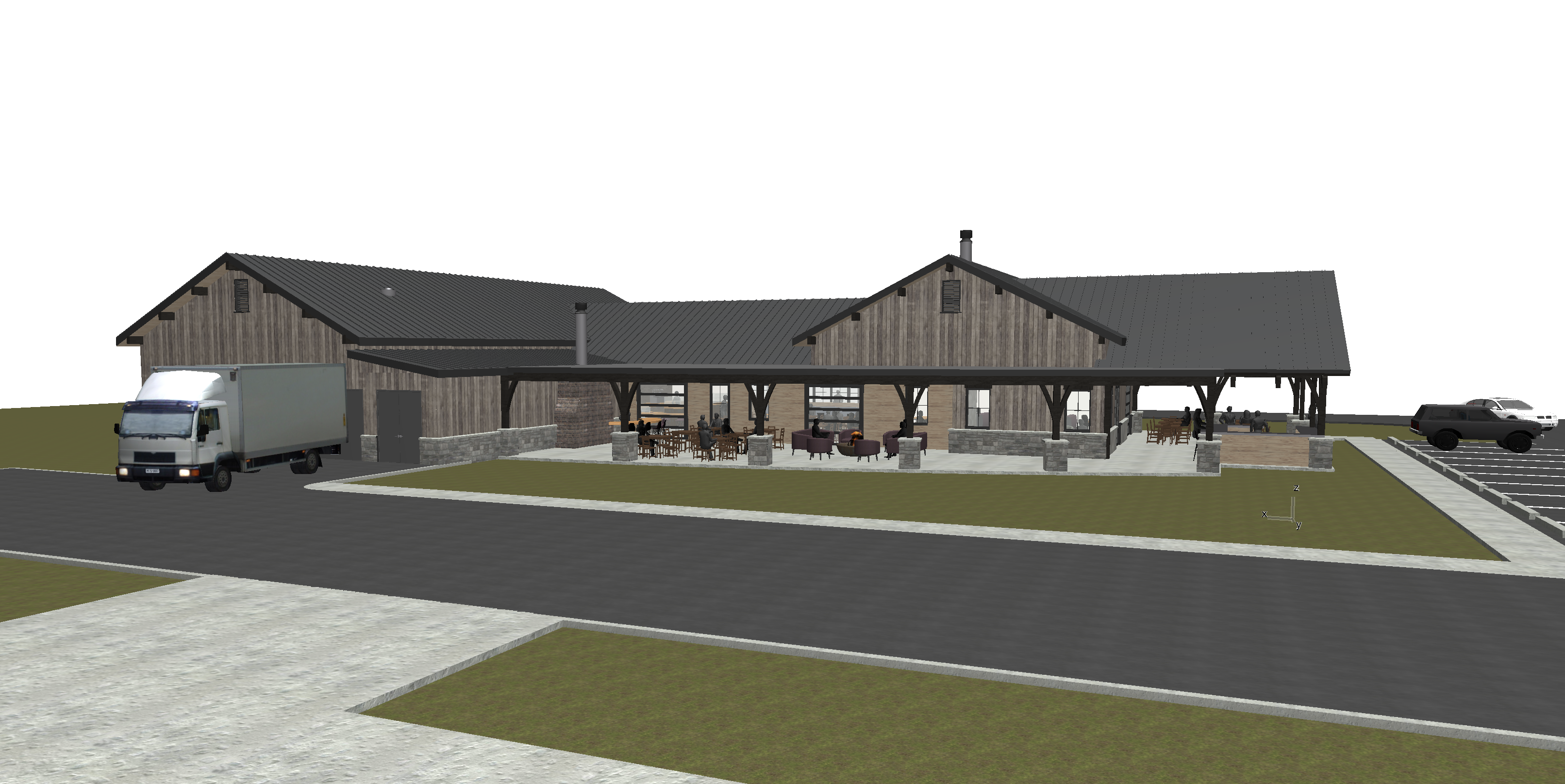 grainy watercolor render of timber frame building with reclaimed wood siding and stone wainscot watercolor trees and urban environment in the background watercolor landscaping surrounding the building architecture