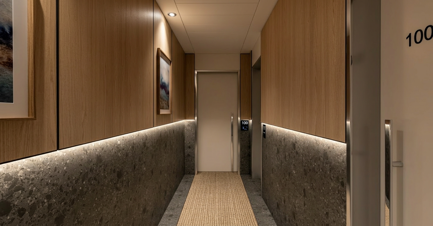 create a realistic interior room led on the mirror on the right wood where the radiator is on the front t ambient light light oak wood with white undertones