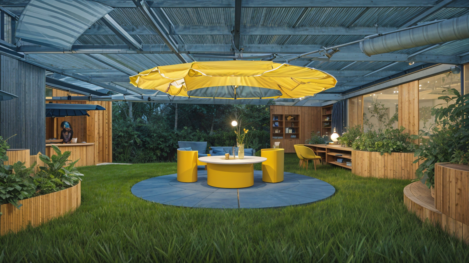 constructivism exterior shot light stucco and brown brick metal black roof and black windows mature landscape and bright summer day with white clouds in the back ground architecture