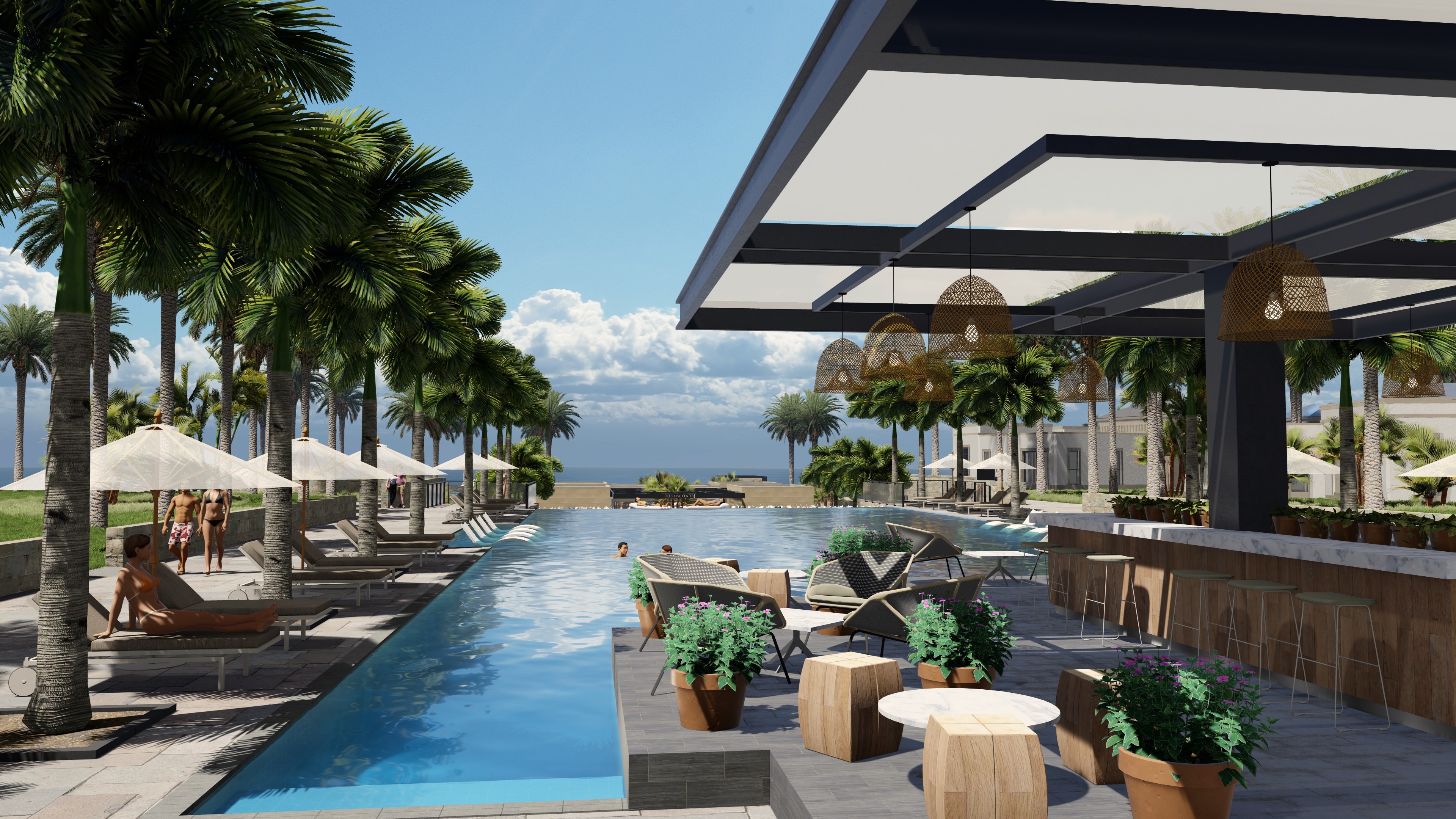keep the materials the same as the source image but enhance the look of them make the people look more realistic add people in pool attire sitting in the lounge chairs having drinks add two people sitting at the bar having drinks and snacks add a few people swimming in the pool add a woman and a boy and girl sitting in the lounge chairs having snacks in pool attire