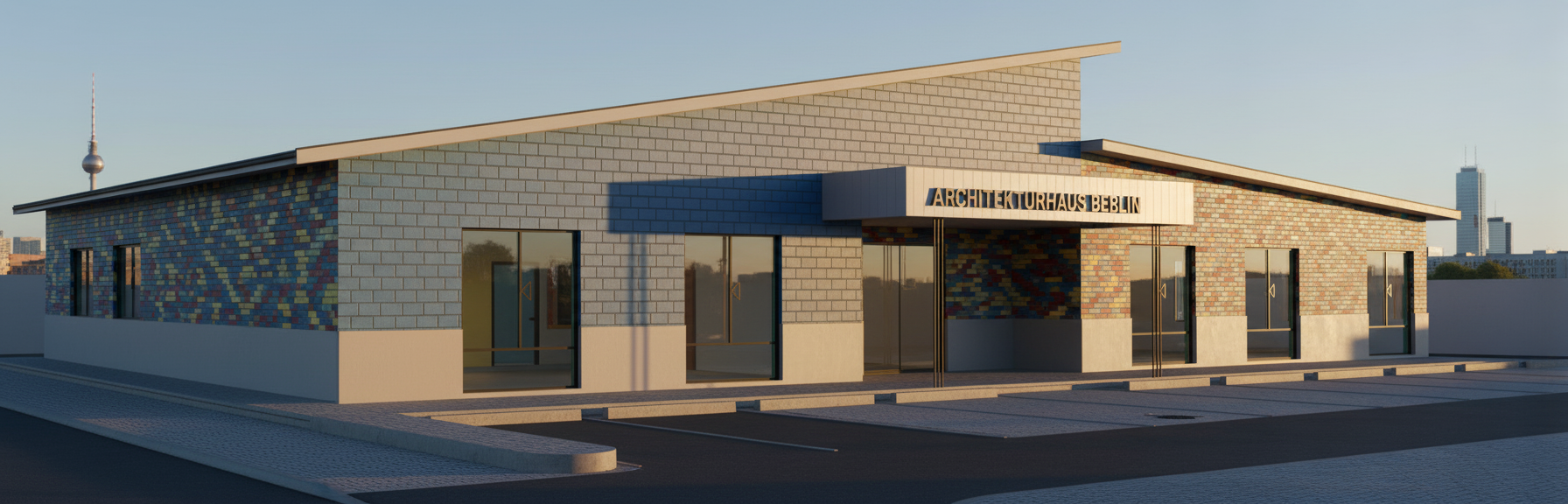 this is the main living space in a small modern home shot from the kitchen area towards the living room the far wall has two separate coat closets and there is a large lit gas fireplace below the large tv the back door is a solid black wood door the ceiling and floor should be in a walnut plank with the walnut planks going front to back outside the windows should be spruce and pine trees with golden hour lighting