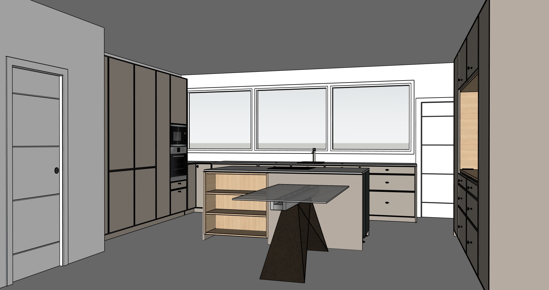 crea una imagen fotorealista en base a este sketchup realza texturas e iluminacion al fondo a la derecha hay una puerta de color balnco los muebles columna son lacados en beige a ade algo de decoracion para la cocina