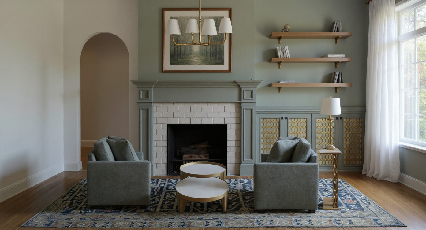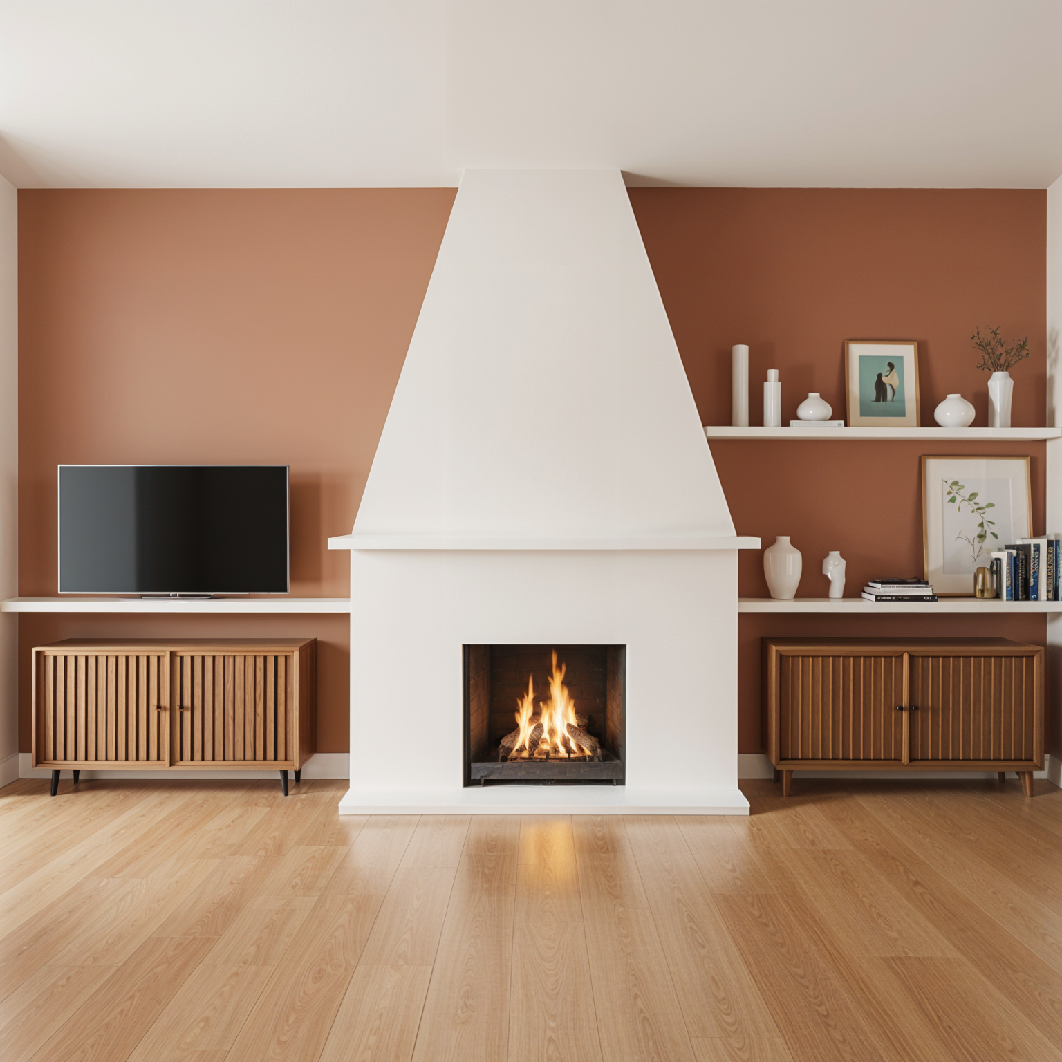 add four floating shelves on the right side of the mantel above the cabinet make the drywall on the left white add artwork above the mantel add open archway to left side of fireplace match shelves to mantel color