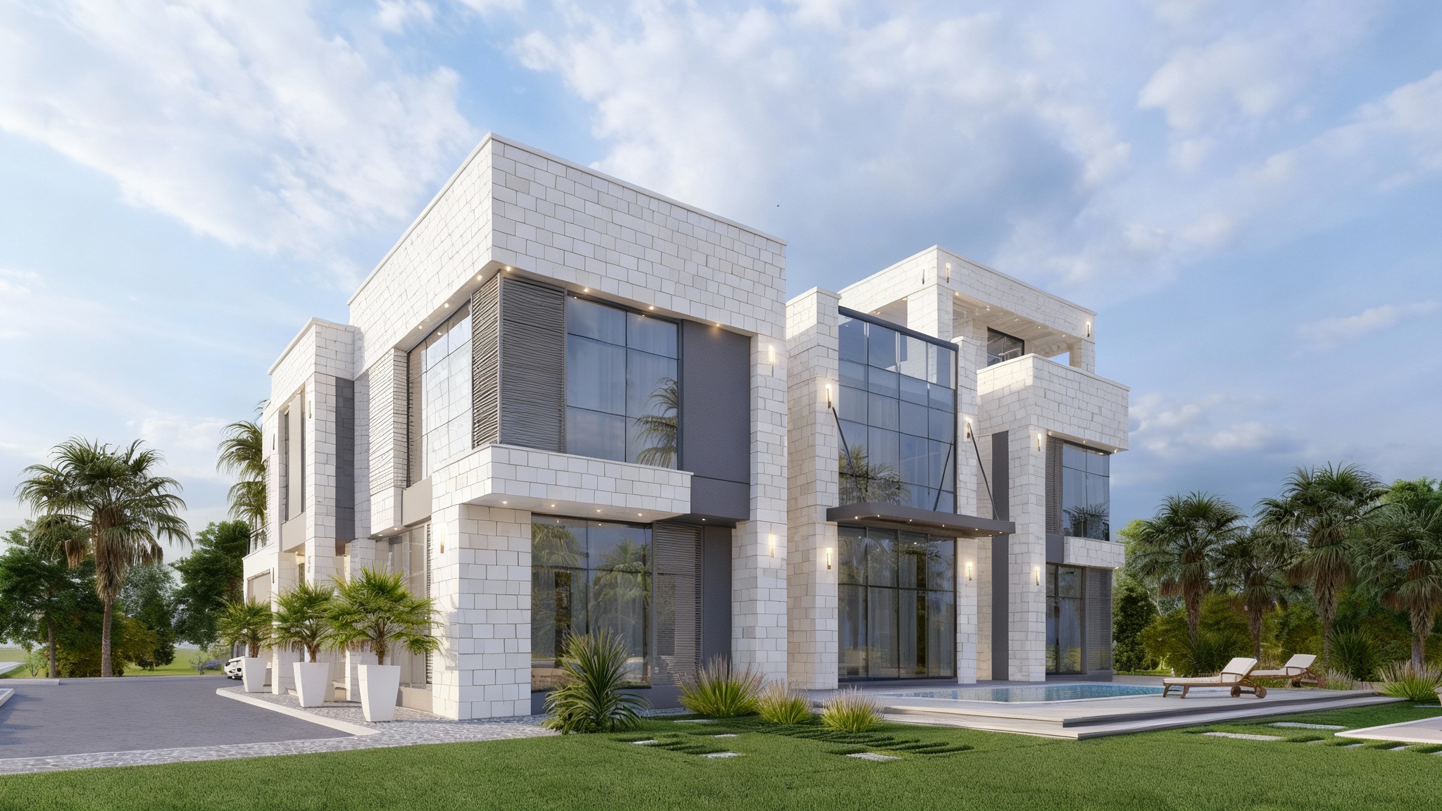 render an elegant spacious interior with a high vaulted ceiling in rich dark wood incorporate long slender modern light fixtures hanging down casting a warm soft glow throughout the room the space is surrounded by tall large windows framed in a sleek black finish allowing natural light to filter in the walls are a subtle neutral beige complementing a cool polished concrete floor in a light gray tone aim for a sophisticated and contemporary atmosphere highlighting clean architectural lines and a harmonious blend of natural and industrial materials