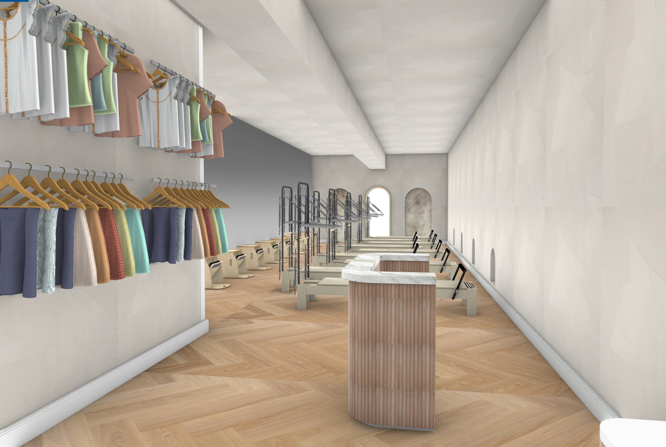 a photorealistic high end interior render of a modern pilates studio with a retail and reception area matching the exact layout proportions and camera angle of the reference image do not change the layout or composition only enhance realism materials and lighting the flooring is natural oak wood in a herringbone pattern with ultra realistic grain detail subtle tonal variation and a matte finish with soft reflections all walls and the ceiling are finished in cream toned polished plaster with soft handcrafted texture subtle tonal variation and gentle imperfections for realism the ceiling should feel refined and seamless maintaining the same structure as the reference on the left wall include mounted clothing racks displaying premium pilates apparel neutral toned elevated activewear in soft fabrics beige sage cream muted pastels the garments should look realistic with natural drape soft folds and high end textile detail use wooden hangers with a refined finish the check in desk in the foreground should be highly detailed and luxurious a curved form clad in vertical ribbed wood paneling with realistic grain and depth the countertop should be sage green marble with natural veining soft polish and subtle light reflection ensure the materials feel premium and tactile above the check in desk add a refined chandelier minimal yet elegant with warm lighting that complements the space and enhances the reception area the rest of the studio must remain consistent with the first image full length floor to ceiling mirror on the left wall with a continuous warm led strip at the base pilates reformer beds in the same layout upgraded with premium materials and realistic detailing wooden pilates chairs with refined natural finishes back wall arches with antique bronze mirror panels and integrated warm led strip lighting right wall niche arches containing pilates equipment properly scaled and aligned lighting should be soft natural daylight from the left combined with warm ambient led lighting and chandelier illumination use global illumination soft shadows ambient occlusion and realistic reflections avoid harsh lighting everything should feel diffused and high end ensure perfect proportions no distortion architectural visualization quality ultra detailed materials and subtle imperfections for realism