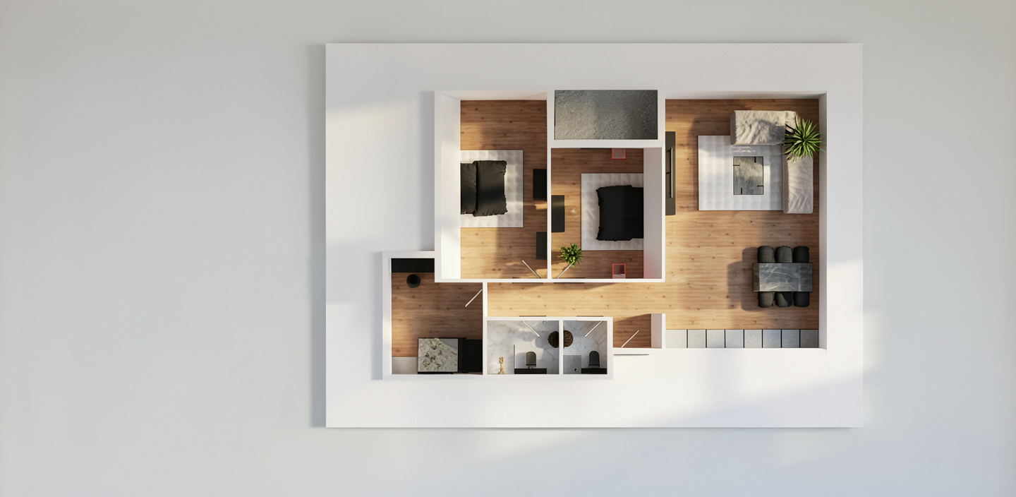 do not change the geometry and colors and materials put to the left wall put a black sink which is part of the shelf the shower is black matte the wall behind the toilet cistern is with modern glossy bricks