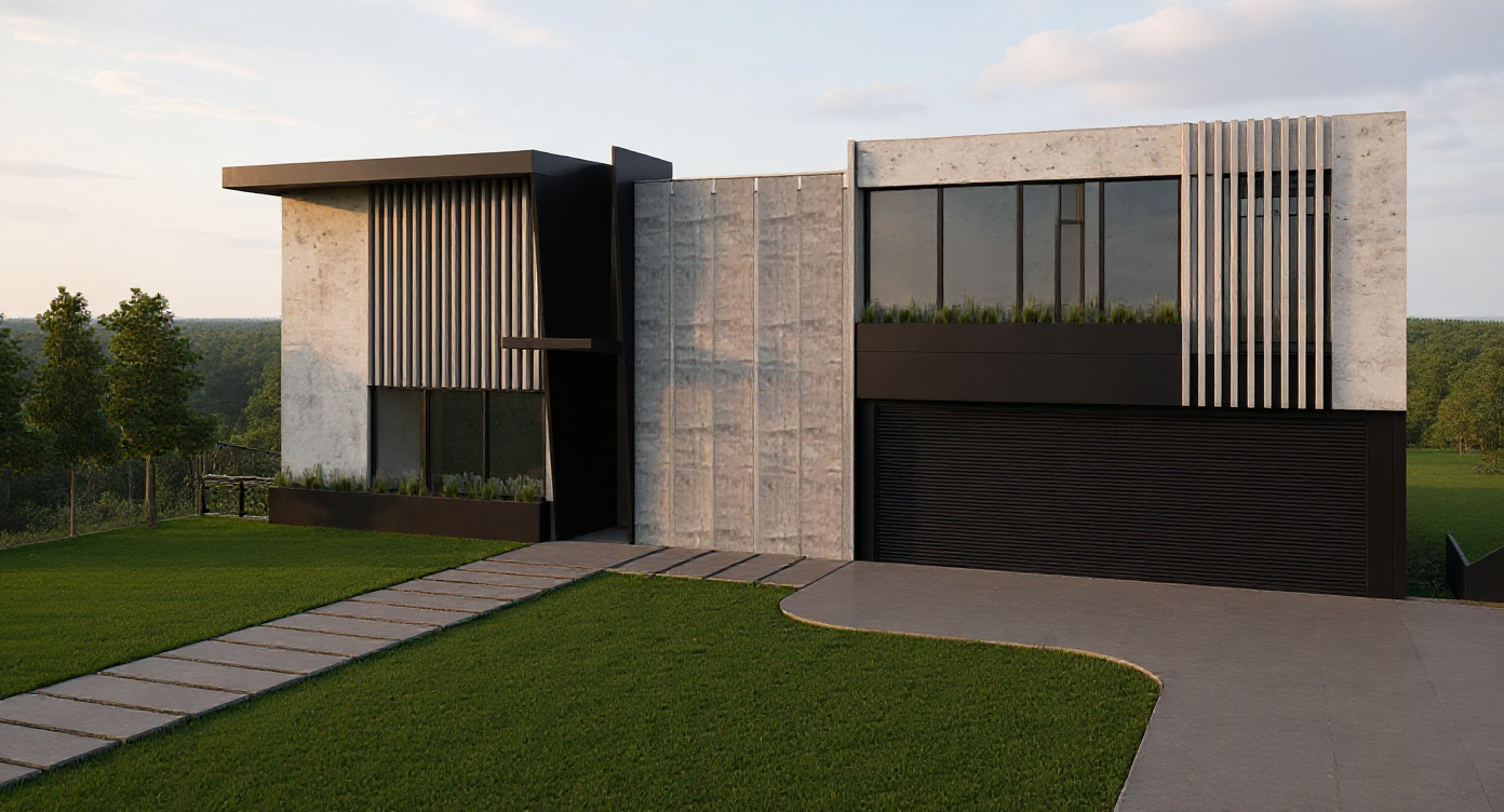 room floor is concrete walls are white ceiling is double height and black the art work is big above the sofa lighting is track light add a brown rug